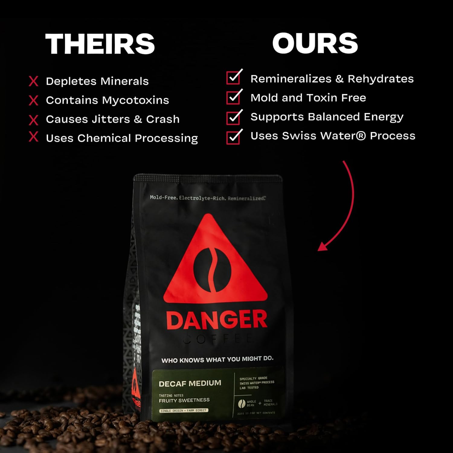 Danger Coffee by Dave Asprey, Remineralized, Mold Free & Lab Tested Swiss Water Decaf Whole Bean Coffee, Medium Roast, Decaffeinated 10.9 Ounce