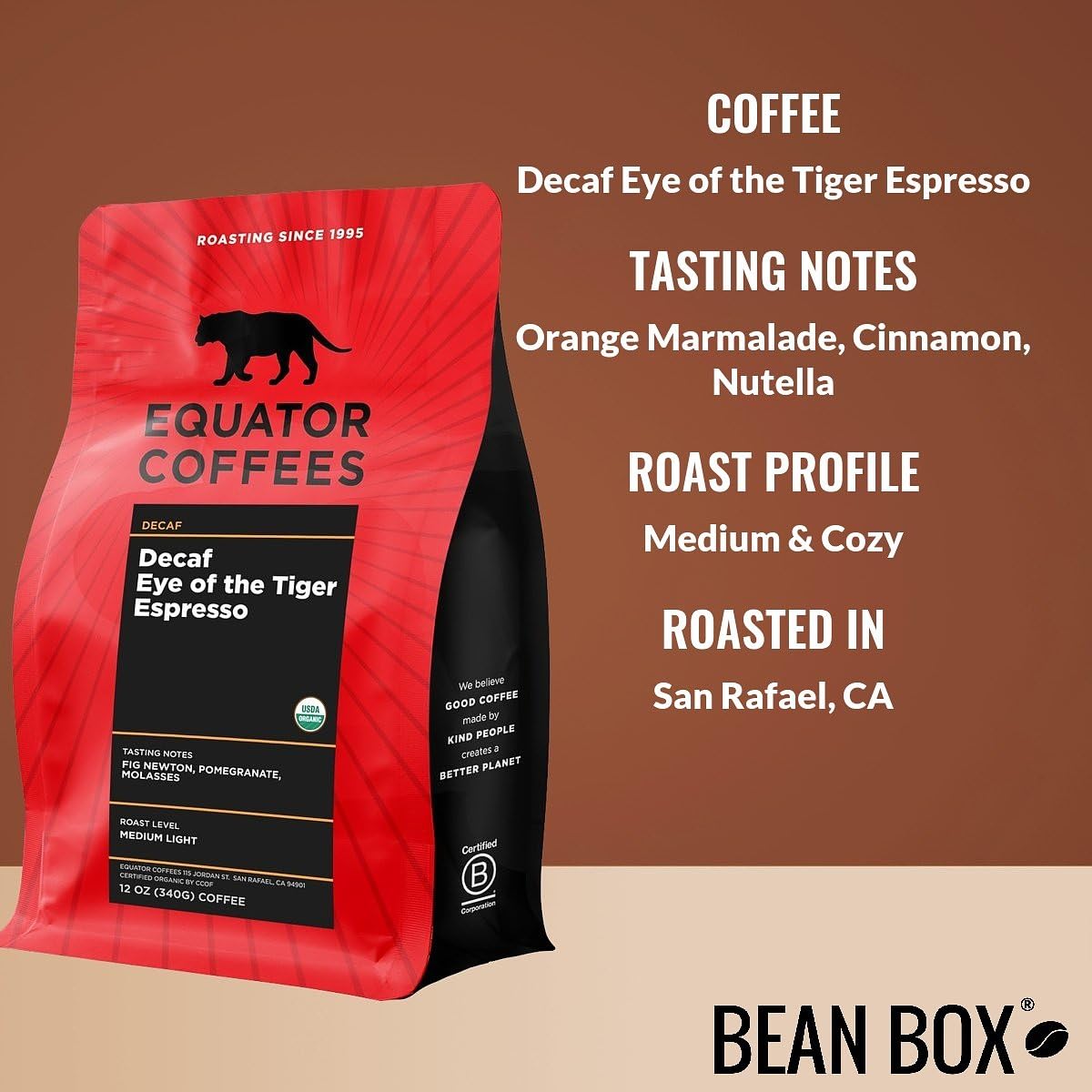Decaf Eye of the Tiger Espresso – Roasted by Equator Coffees – Whole Bean Coffee – 12 Ounce Bag