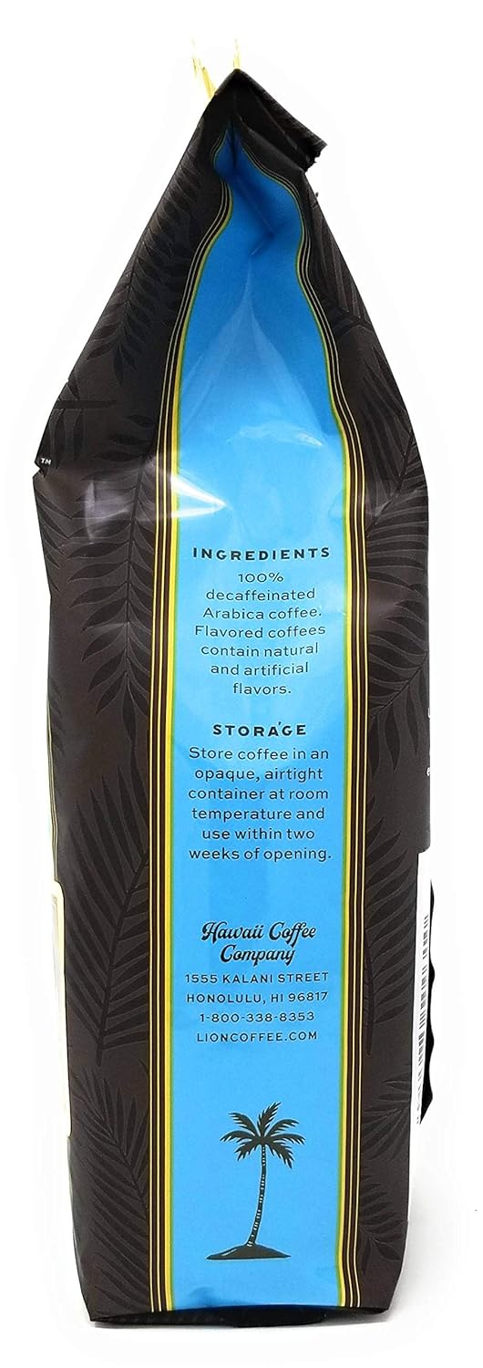 A classic Lion tropical flavored coffee. Lightly roasted coffee flavored with the distinctive aromas and tastes of Vanilla Beans and Macadamia Nuts. The brewed coffee has a rich smooth taste with Vanilla flavor notes predominate and with more subtle Macadamia Nut background flavor notes. One of our top selling flavored coffees. Decaffeinated using the