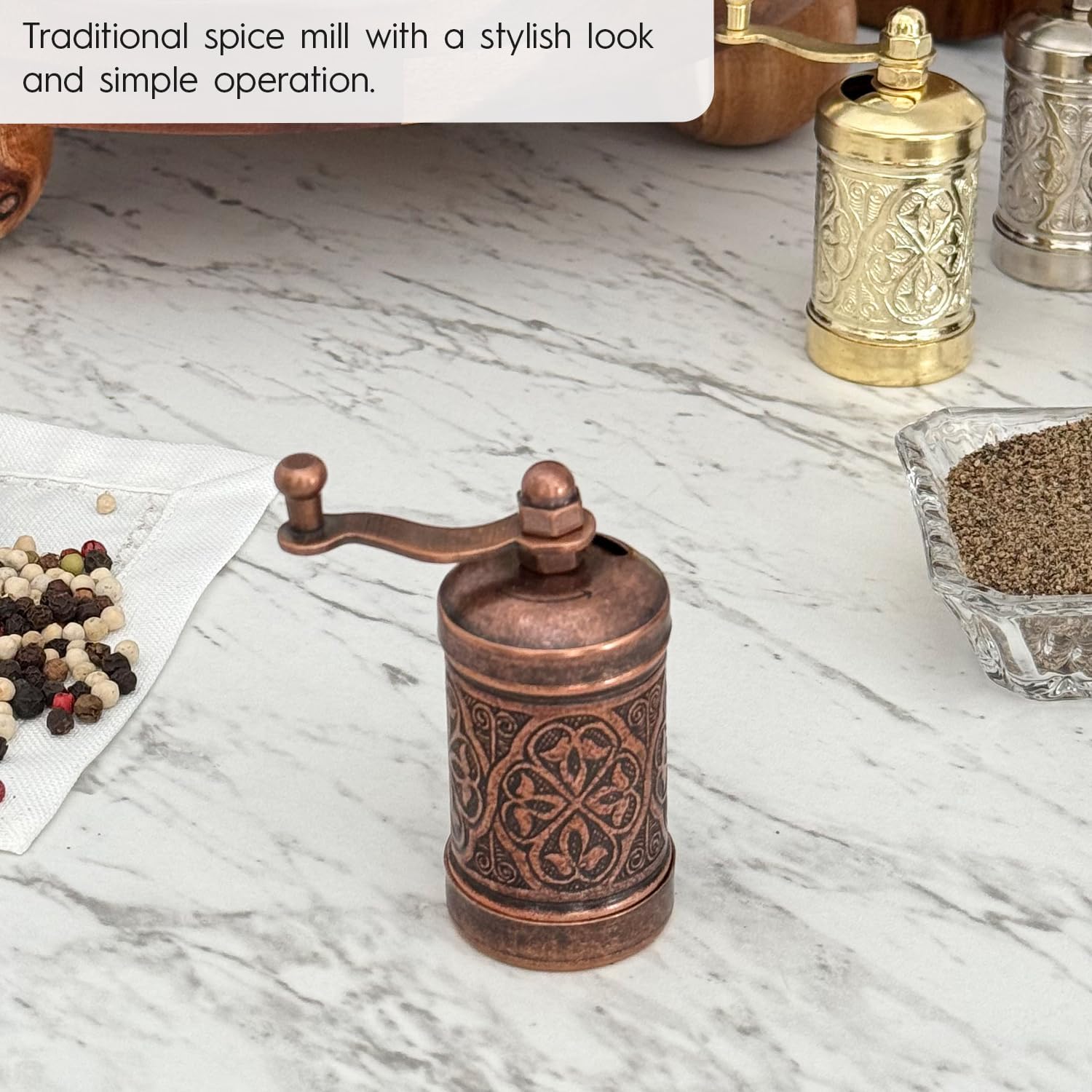 Decorative Handmade Black Pepper Grinder, Refillable Turkish Spice Mill with Adjustable Coarseness, Manual Pepper Mill with Handle, Spice Grinder with Hand Crank 8 cm-3.1 inch (Bronze)