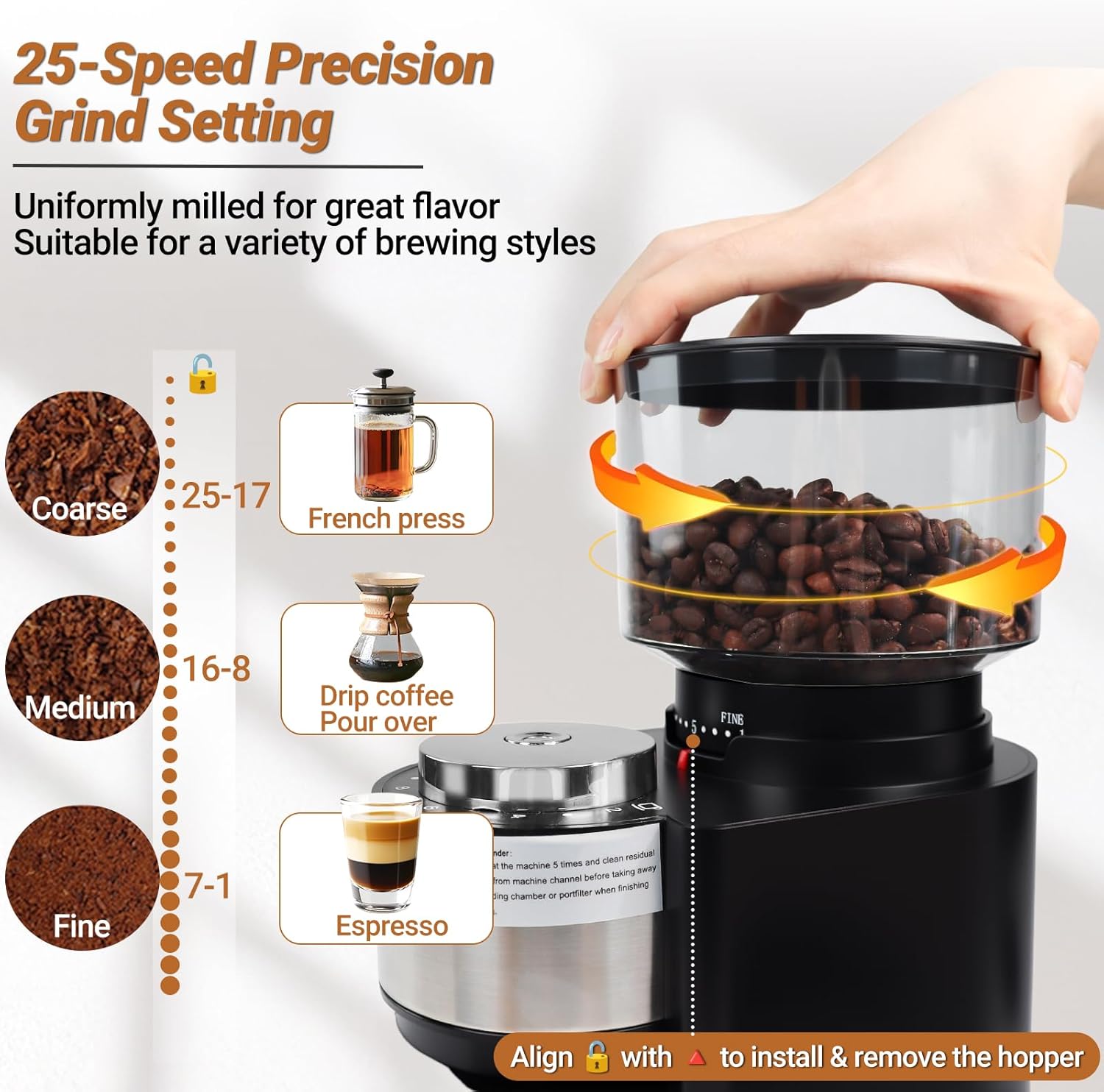 Easy to Clean: Removable bean hopper, bean hopper lid, c, grinding chamber, grinding chamber lid and the upper burr can be cleaned with warm water (no soaking or machine washing), equipped with special cleaning brush. Wipe the body with a damp cloth and dry with a soft, dry cloth. After use and before cleaning, please make sure to disconnect the power, and regularly use the cleaning brush to clean the grinding disk residual powder to maintain the best grinding condition