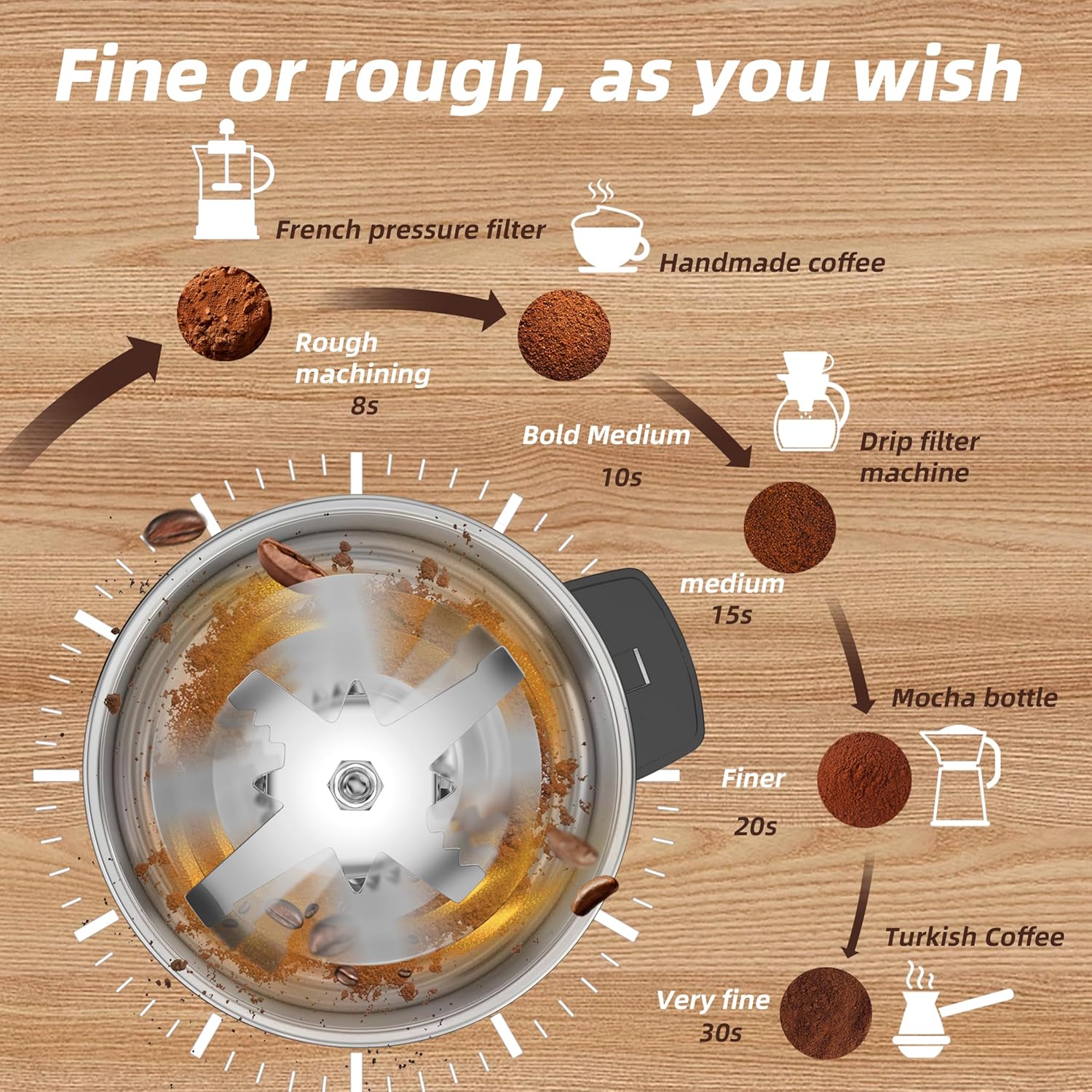 ✅【Powerful and Efficient】The electric coffee grinder has a power of 300 watts and has 4 stainless steel blades. It can grind coffee in 8-30 seconds and the longer the time, the finer the powder will be. During the grinding process, the ingenious design of the top lid prevents dust from splashing.