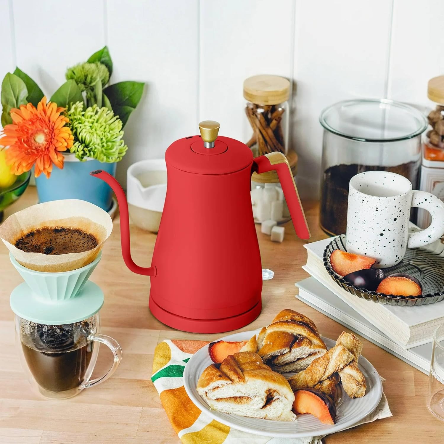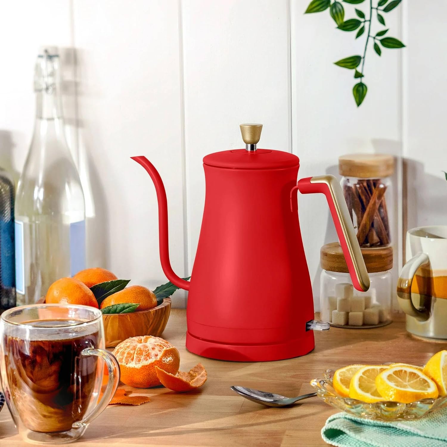 Electric Gooseneck Kettle, 1 Liter Capacity, 1200W Cordless Stainless Steel Tea and Water Kettle (Tomato Red)