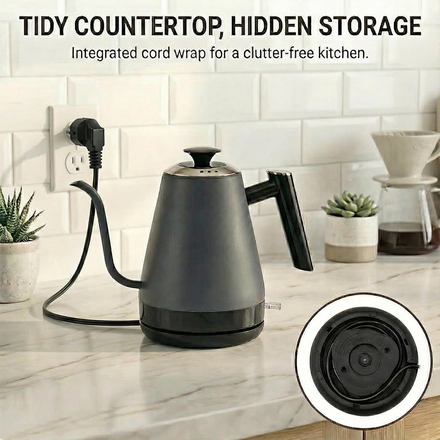 【RELIABLE SAFETY & TIDY STORAGE】 Built for peace of mind, the kettle features advanced auto shut-off and boil-dry protection technology, turning the unit off automatically when water boils or the pot is empty. The base is designed with an integrated cord wrap, allowing you to neatly organize the power cable underneath for a clutter-free, modern kitchen countertop.