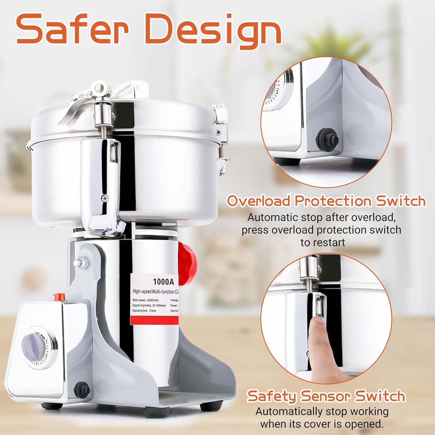 🌽PRODUCT PARAMETERS🌽:Capacity: 1000G,Meterial: 304 Stainless Steel,Voltage: 110V,Rotating Speed: 36000r/min,Power: 2600W,Grinding Degree: 50-300 Mesh,Work Time: 0-5 min,Interval Time: 5 min.