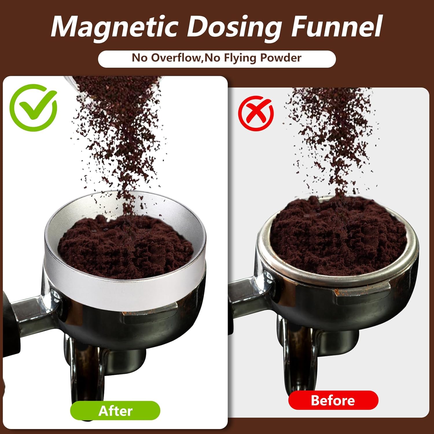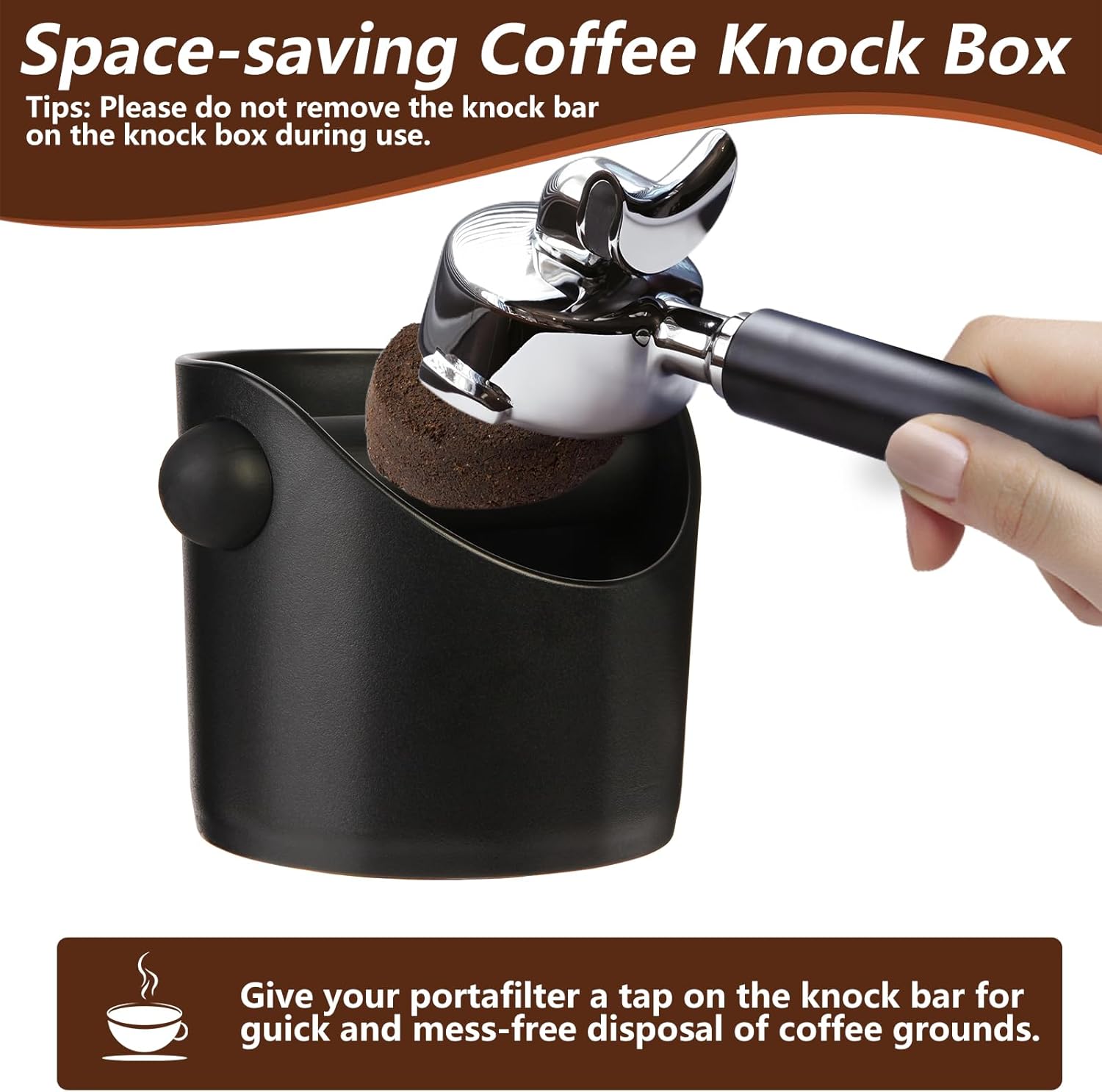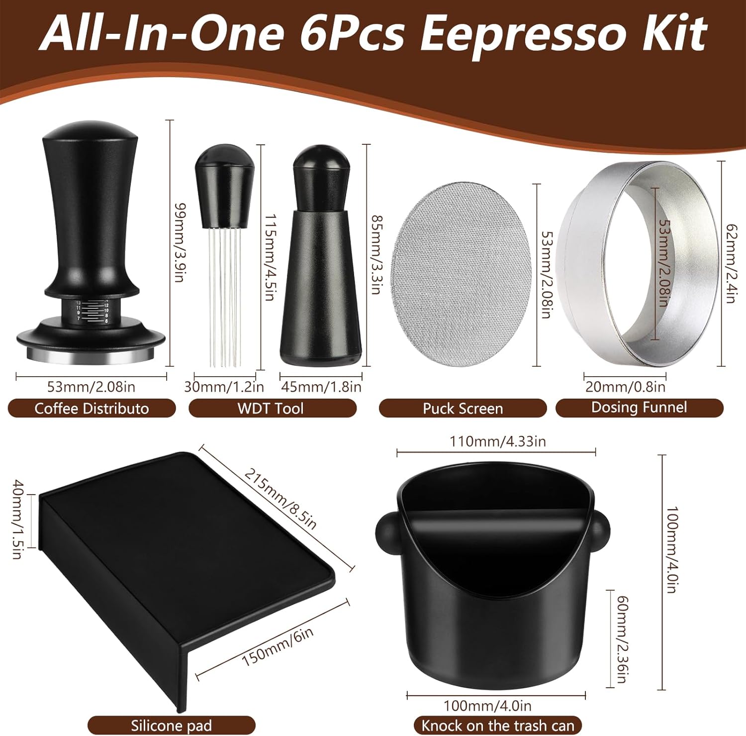 【Complete 54mm Espresso Accessories Kit】 Elevate your coffee setup with this 6-piece kit, including a 54mm espresso tamper with spring & calibration, WDT distribution tool, silicone coffee tamping mat, espresso knock box, dosing funnel, and puck screen. Perfect for baristas and home brewers seeking premium espresso machine accessories for café-quality results.