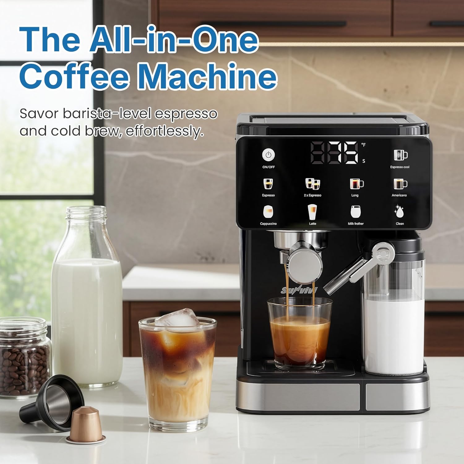 Espresso & Americano Machine with Cold Brew, Iced Coffee Maker with Ground/Capsule Dual Brewing, Touchscreen, Milk Frother, Latte & Cappucinno Maker with 51OZ Water Tank, Self-clean, Black