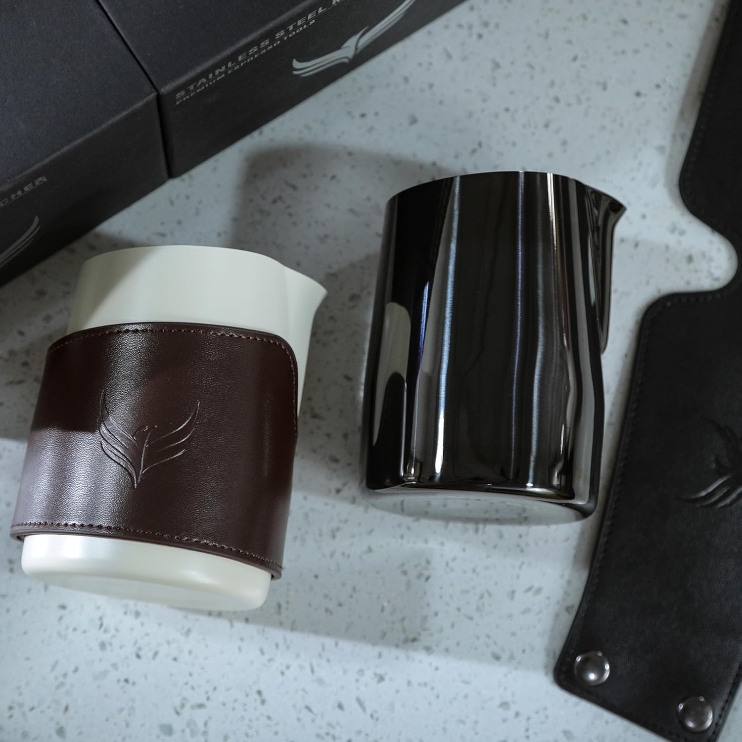 Knodos milk frother pitcher without hande design with real leather sleeve provides a comfortable pro control and stylish look, making it a standout piece among your espresso tools set.