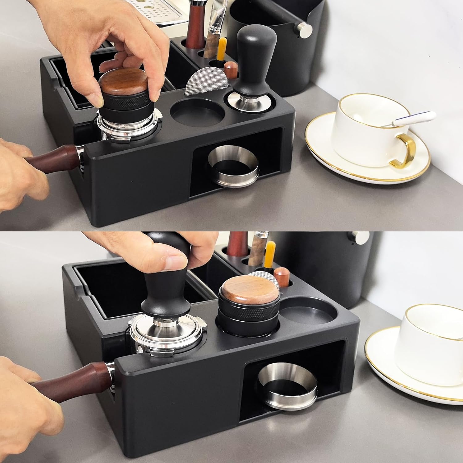 Unique Design:There is a side hole on the side of the tamping station for storing small espresso accessories.The espresso station is designed with a u-shaped groove and an adjustable nut to make it easy to use with your portable filters.The non-slip design on the bottom of the espresso station prevents slippage and protects your coffee countertop.Knock box is adopting black square design and with a tamper station that can hold espresso portafilter.Knock box is detachable,easy to clean