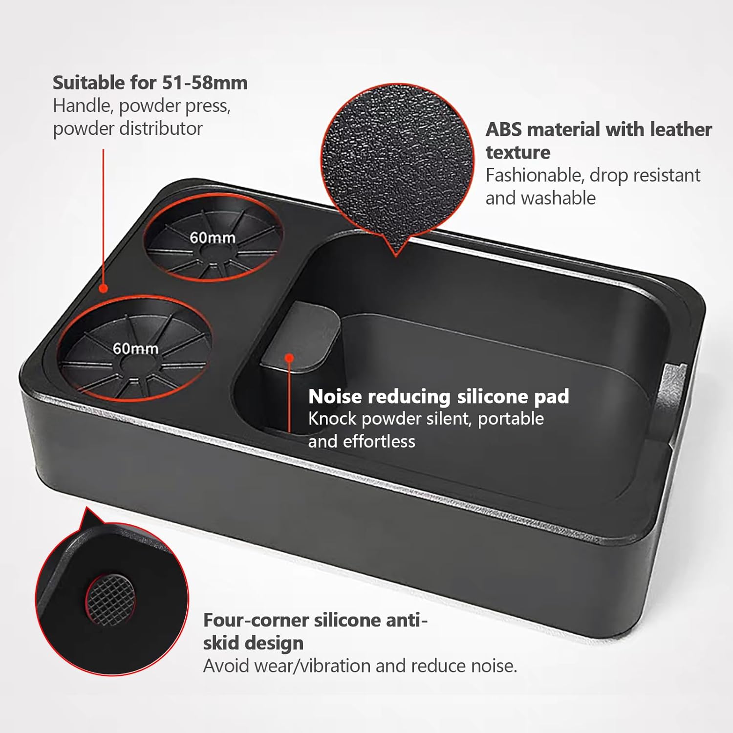 Tamping station knock box of Non-slip silicone base and weighted construction ensure stability during tamping, minimizing vibrations for consistent pressure. Durable ABS material resists scratches and impacts, Anti-slip silicone pads protect countertops.