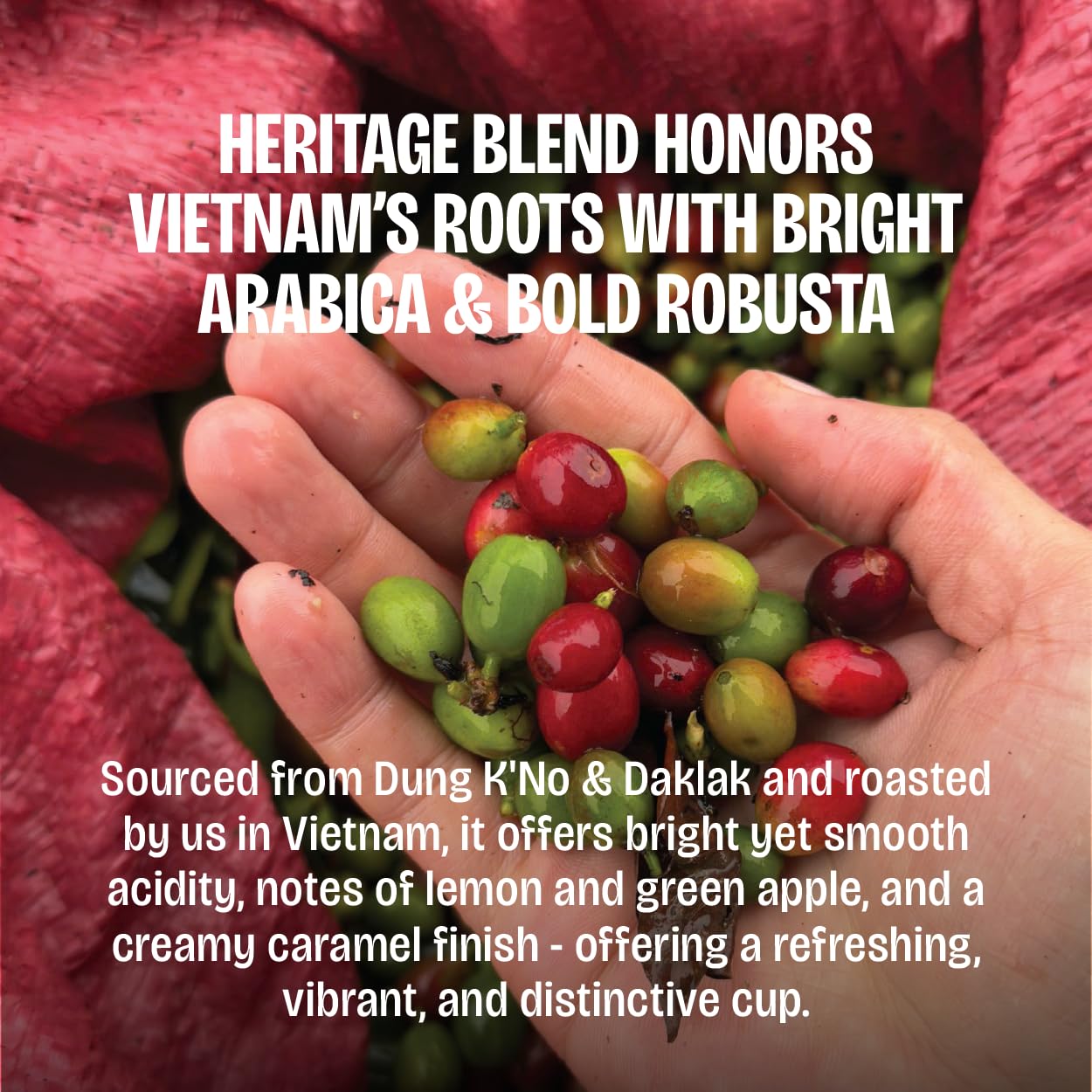 Heritage Blend is freshly roasted whole‑bean coffee produced directly in Vietnam.