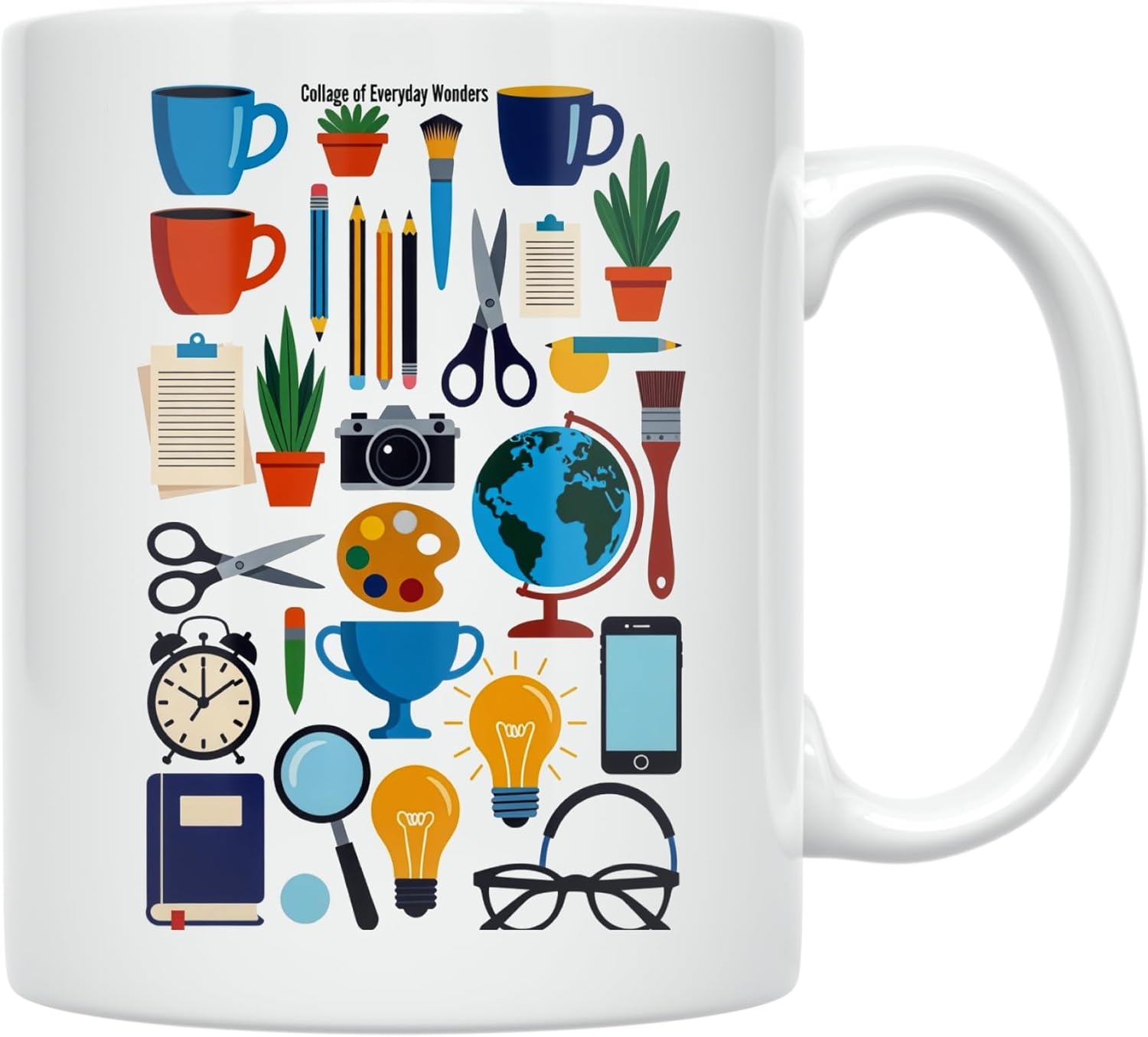 Experience the charm of the mundane with this Everyday Wonders Coffee Mug. This 11 oz white ceramic mug showcases a vibrant collage of everyday objects, including colorful coffee cups, pencils, scissors, plants, a camera, globe, light bulbs, and more, all arranged in an eye-catching mosaic style. The playful design features bright accents and varied sizes that celebrate the beauty found in ordinary items we encounter daily. Crafted from high-quality ceramic, this durable mug is perfect for sipping your favorite coffee, tea, or any beverage at home or in the office. The design is printed on both sides, making it visually appealing from every angle. With its comfortable handle and generous 11 oz capacity, this mug is ideal for your morning routine or afternoon break. Whether you’re working at your desk, relaxing in your kitchen, or need a conversation starter during meetings, this mug invites you to appreciate the little things in life. Dishwasher and microwave safe for easy care and convenience, it fits seamlessly into any space and makes a delightful gift for anyone who finds joy in everyday wonders.