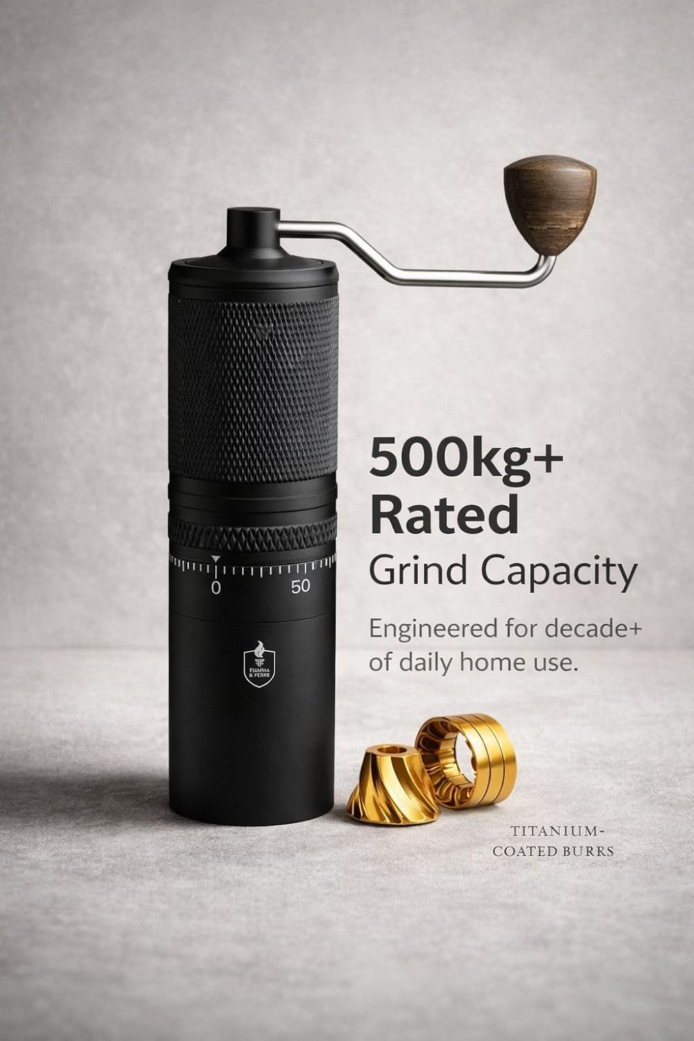 FIAMMA & FERRO Professional Manual Coffee Grinder – Titanium Enhanced 38mm Conical Burrs, 60 Precision Settings, Stainless Steel Construction – 500kg+ Grind life