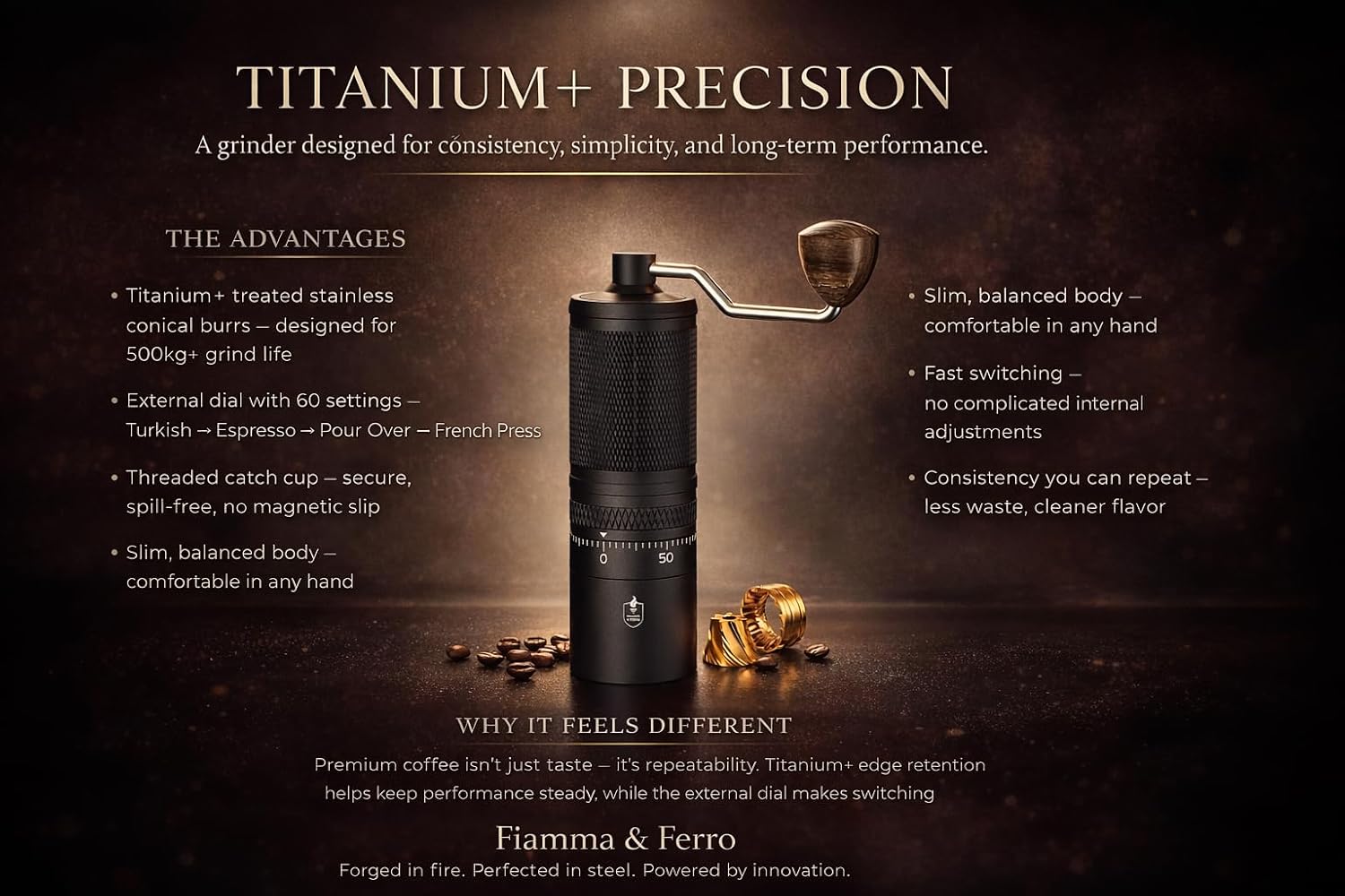 The Fiamma & Ferro Titanium+ Precision Manual Coffee Grinder is engineered for coffee enthusiasts who demand absolute control over flavor, consistency, and craftsmanship. Inspired by Italian espresso heritage and refined through modern precision engineering, this grinder delivers professional-grade results without electricity. At the core is a CNC-cut titanium-enhanced stainless steel conical burr system designed to produce a uniform grind across all brew methods. With 60 precise grind settings, the grinder seamlessly adjusts from ultra-fine Turkish coffee to espresso, pour over, Immersion brewers , and coarse French press, allowing you to dial in your coffee exactly the way you like it. The matte black stainless steel body is built for durability, balance, and long-term performance. Its ergonomic cylindrical shape provides a secure, comfortable grip for a wide range of hand sizes, ensuring smooth grinding with minimal effort. The manual design preserves aroma and heat-sensitive oils while offering complete portability for home, office, travel, RV use, or outdoor adventures. Each grinder includes a premium travel storage bag and a dedicated cleaning brush, making maintenance simple and transport effortless. Designed to be used for years—not replaced—this is a precision coffee tool for those who value quality, longevity, and exceptional taste in every cup.