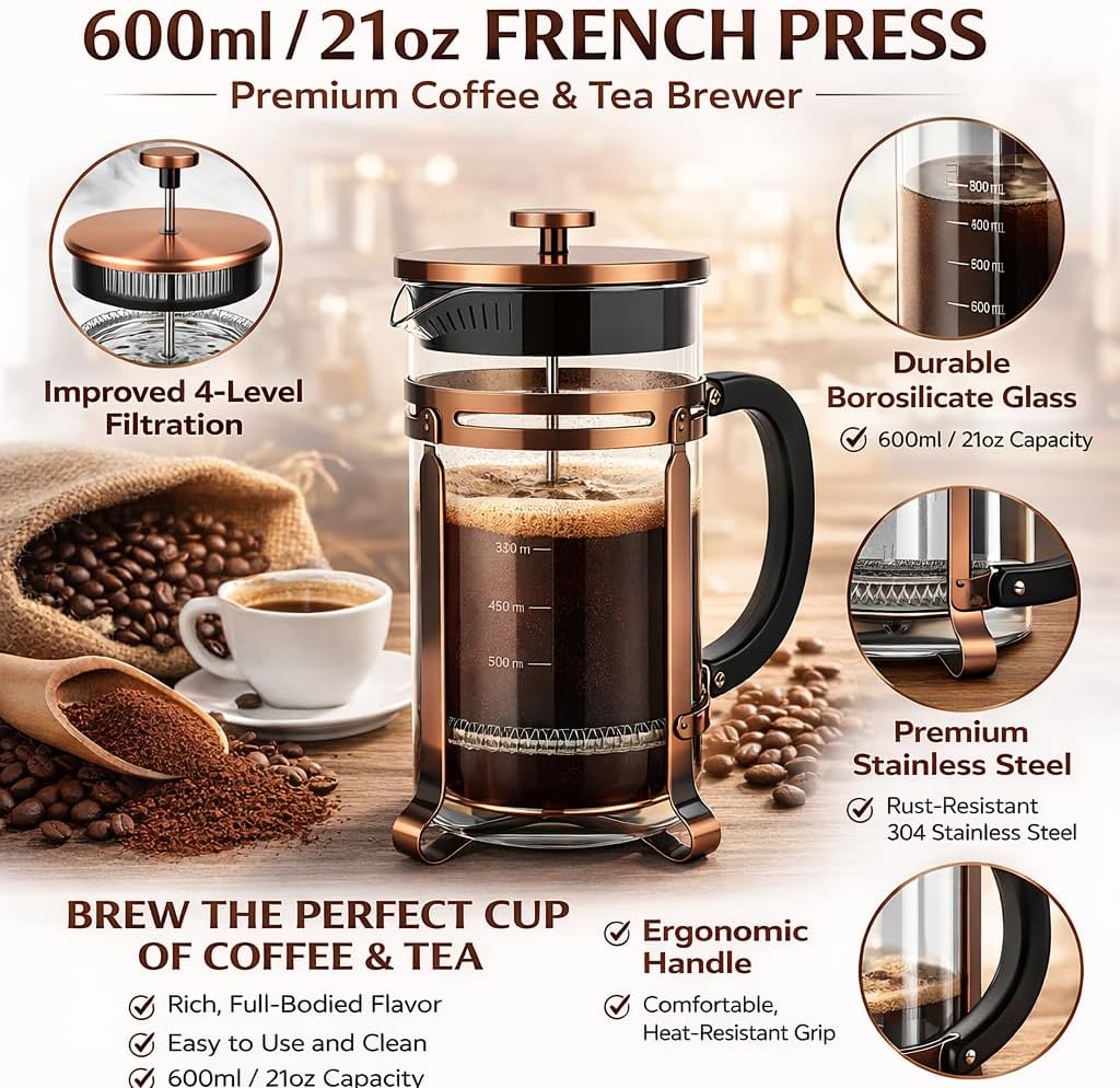 French Press Coffee Maker, 21Oz Coffee Press with 304 Stainless Steel 4 Filters, Borosilicate Glass Heat Resistant Carafe, 100% BPA-Free Teapot & Coffee Press, Copper Finish