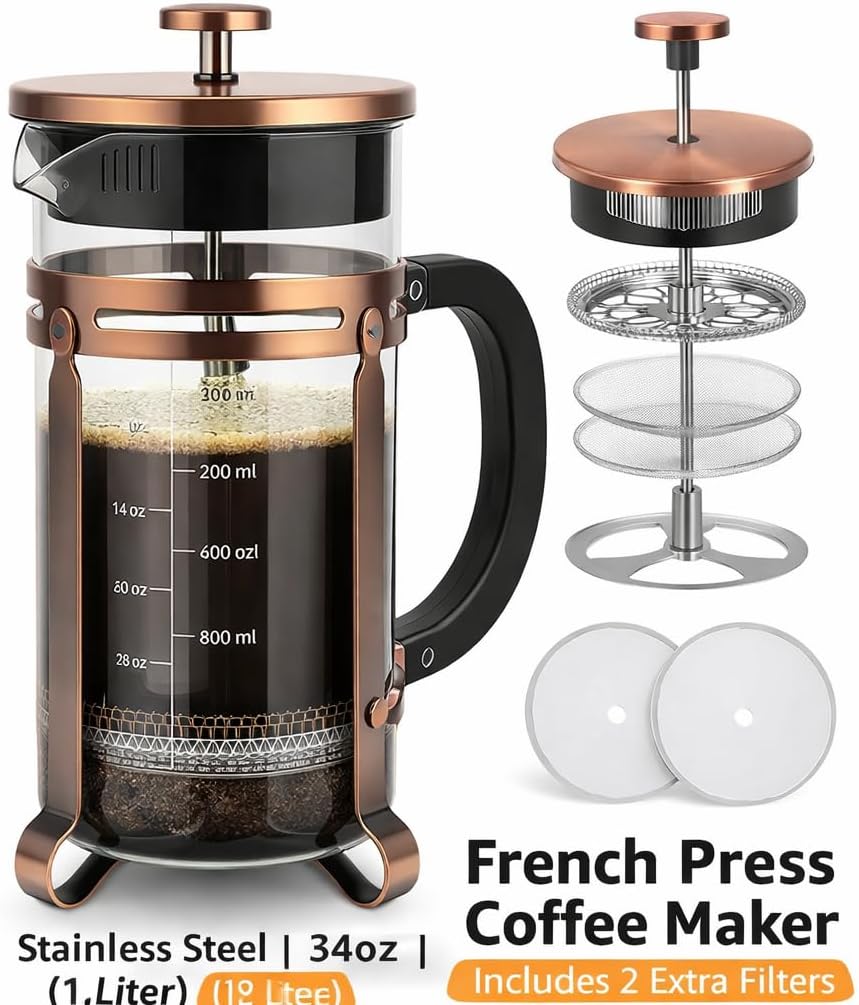 French Press Coffee Maker 34 oz, 304 Stainless Steel Double Mesh Filter, Borosilicate Glass, Heat-Resistant, BPA-Free, Large Capacity for Family & Office, Great Gift