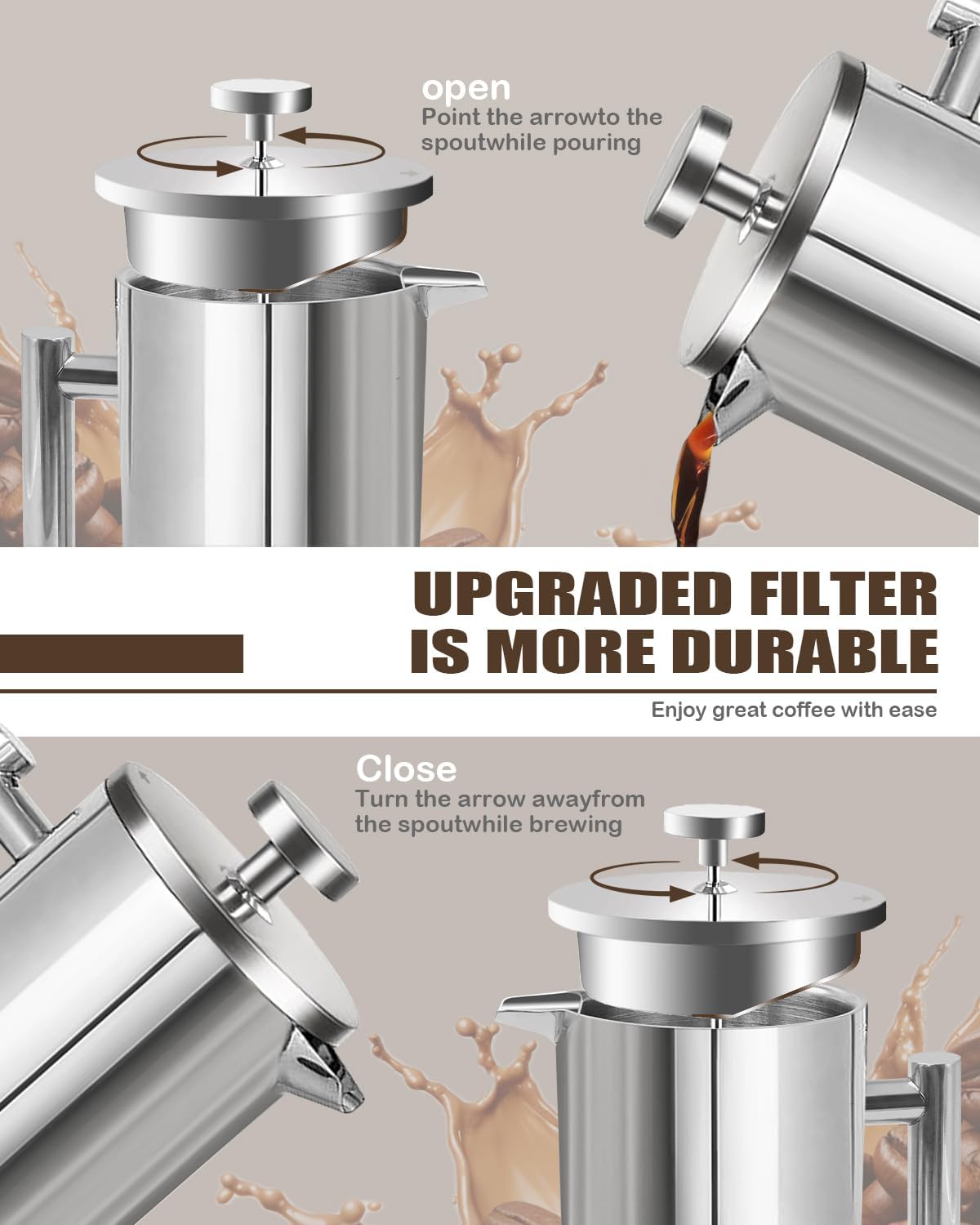 FILTRATION SYSTEM: Double-mesh stainless steel filter effectively separates coffee grounds from liquid while preserving essential oils