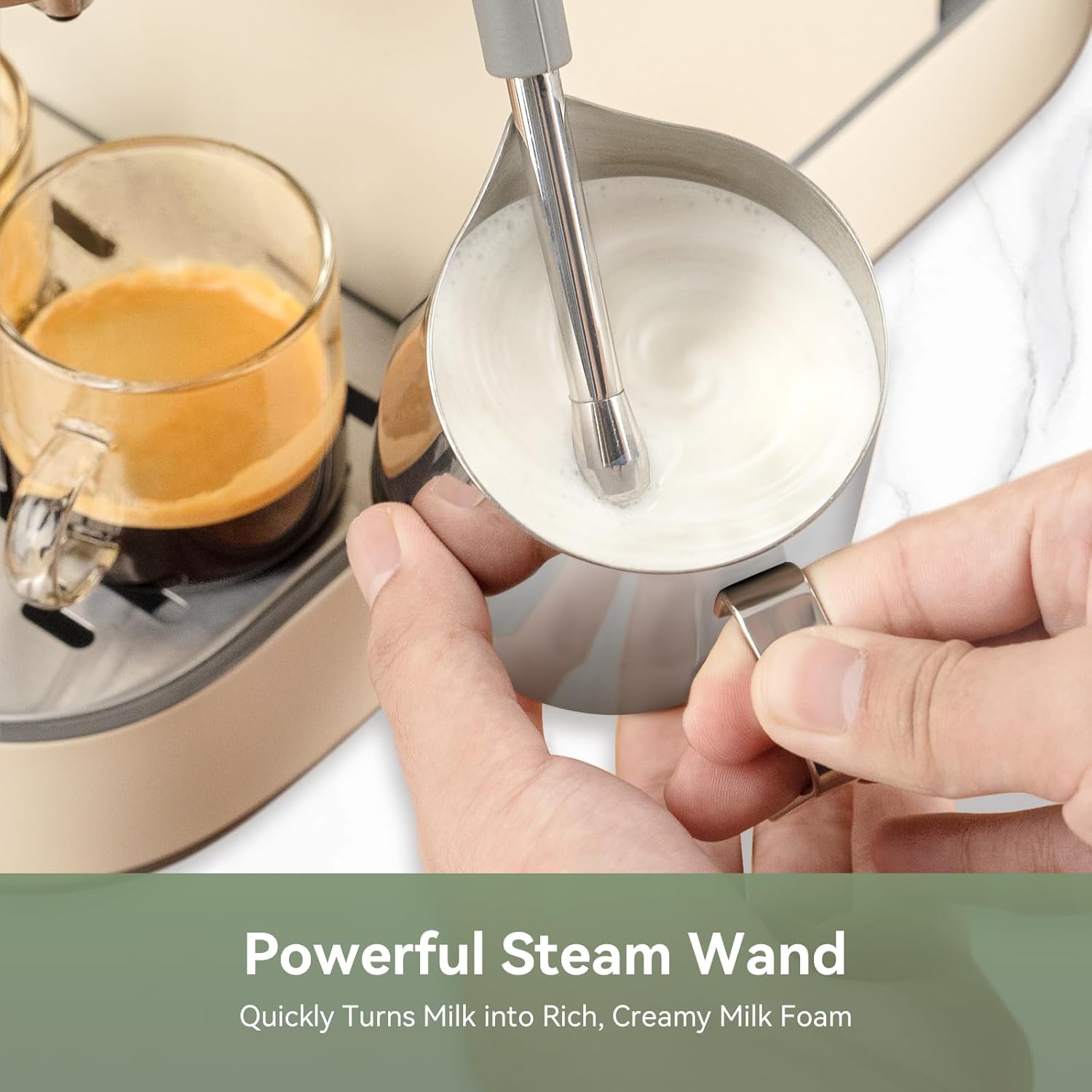 【POWERFUL STEAM SYSTEM】The espresso coffee maker with frother features a powerful steam wand that quickly turns milk into silky smooth microfoam. Easily create café-quality, Cappuccinos, and other espresso beverages.