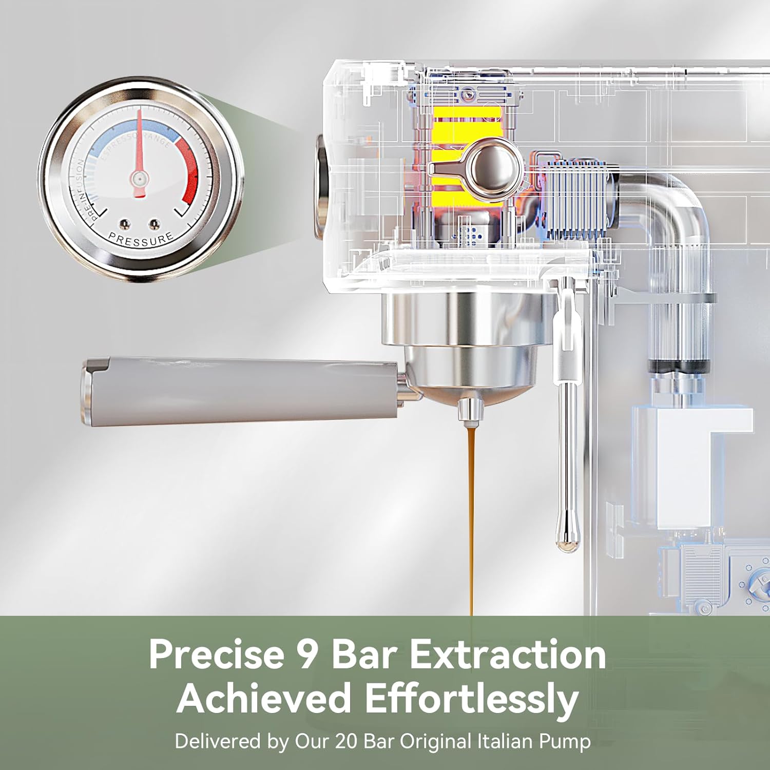 【PROFESSIONAL 20 BAR PRESSURE SYSTEM】 With a 20-bar professional Italian pump, the Gevi espresso machine with grinder provides optimal espresso extraction, making the espresso more fragrant and rich in crema.