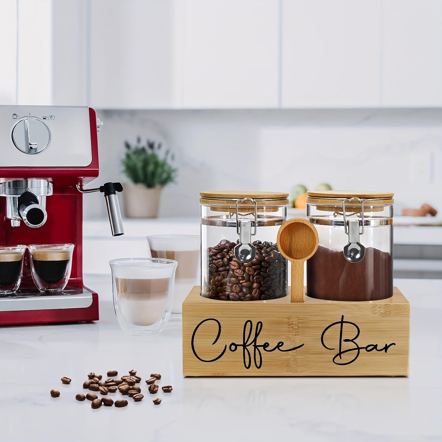 Complete Set with Convenient Accessories – Includes 2 glass jars, 1 wooden scoop, and 1 bamboo shelf for neat, space-saving storage while adding a decorative touch to countertops or coffee stations.