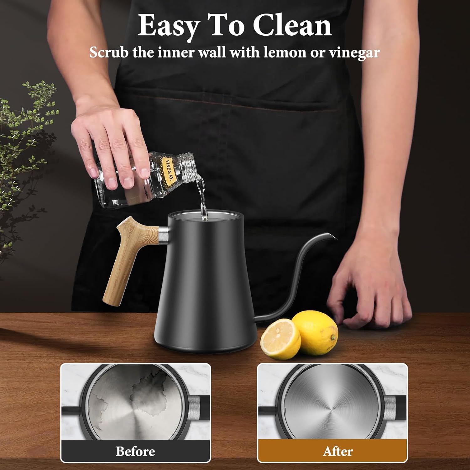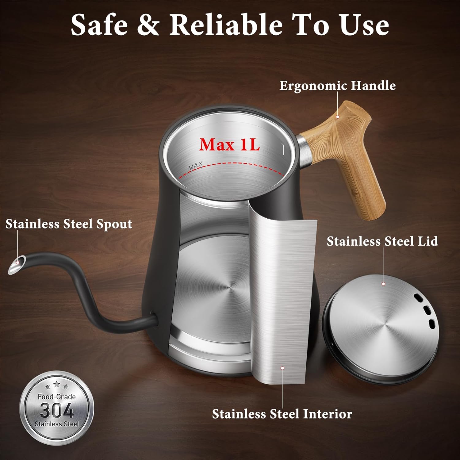 【The Purest Taste】The electric tea kettle’s durable interior, lid, and spout are made with food-grade 304 stainless steel, no more worrying about rust and scaling, ensuring the purest taste and indulging in the beauty of coffee and the layering of tea.