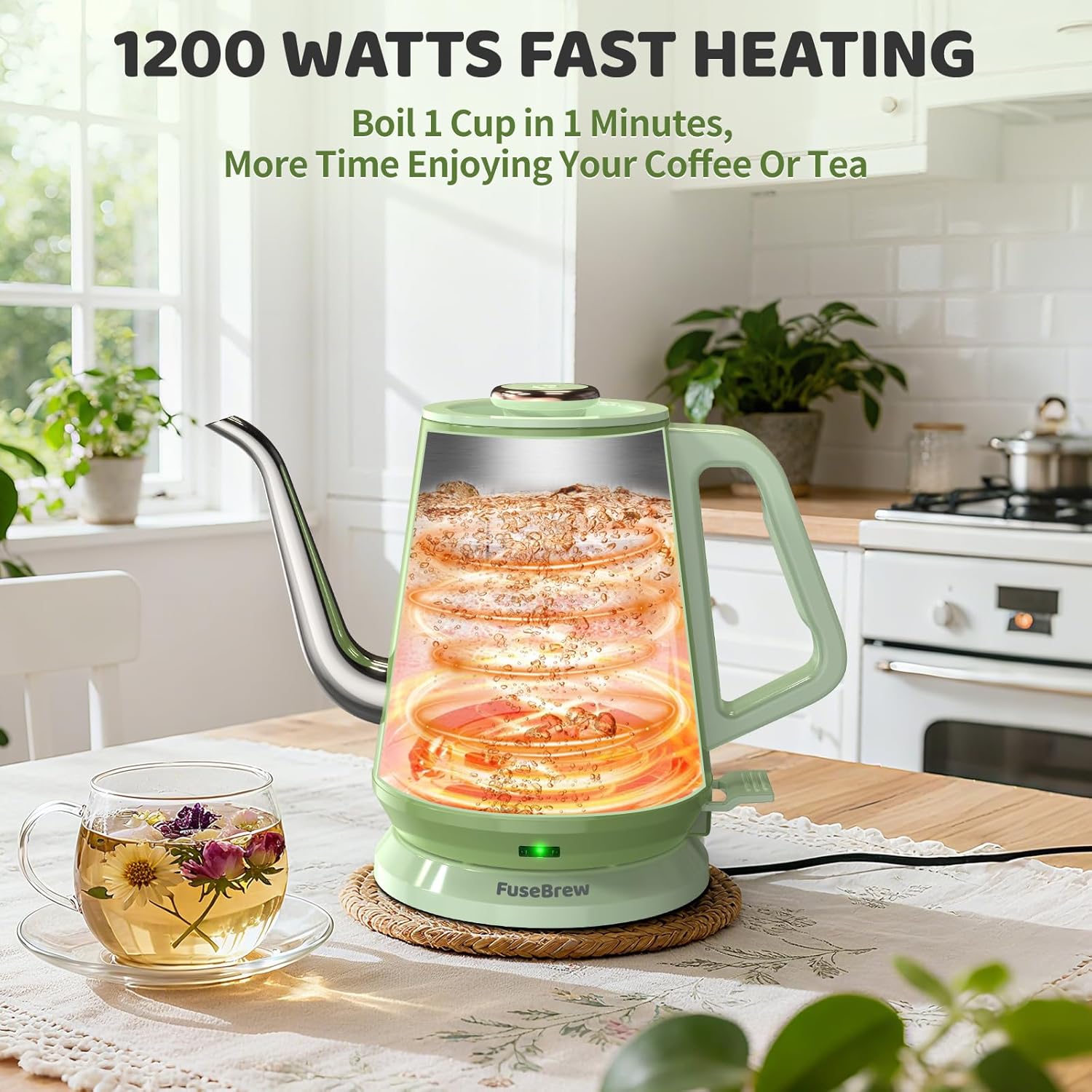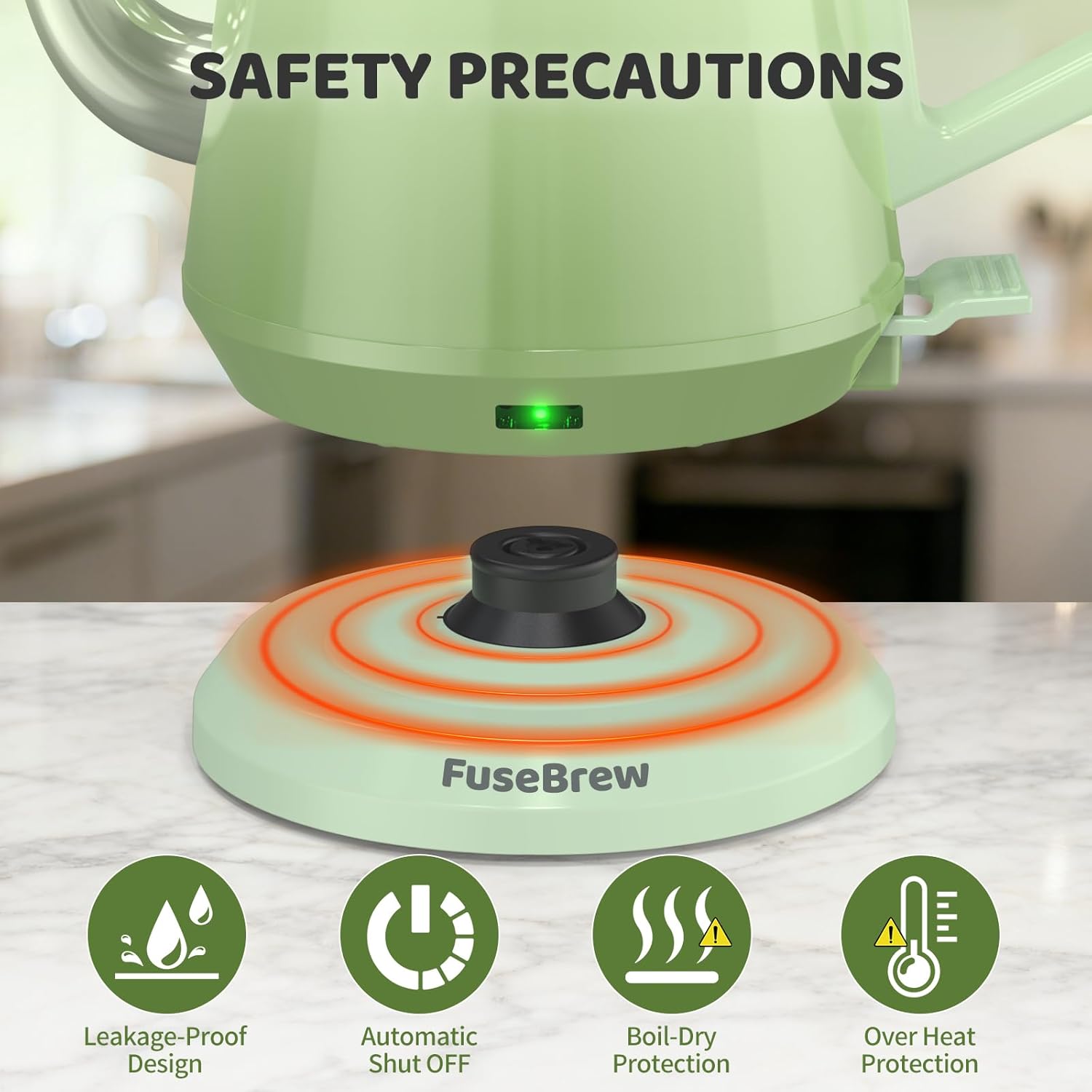 Rapid 1200W Heating System with Multi-Safety Protection: FuseBrew electric gooseneck kettle equipped with a high-efficiency 1200W enclosed heating element, capable of bringing 0.8 liters of water to a boil in approximately 3-4 minutes. The system integrates boil-dry protection and an automatic shut-off function triggered upon reaching boiling point or when the kettle is removed from its base, enhancing operational safety and product durability.