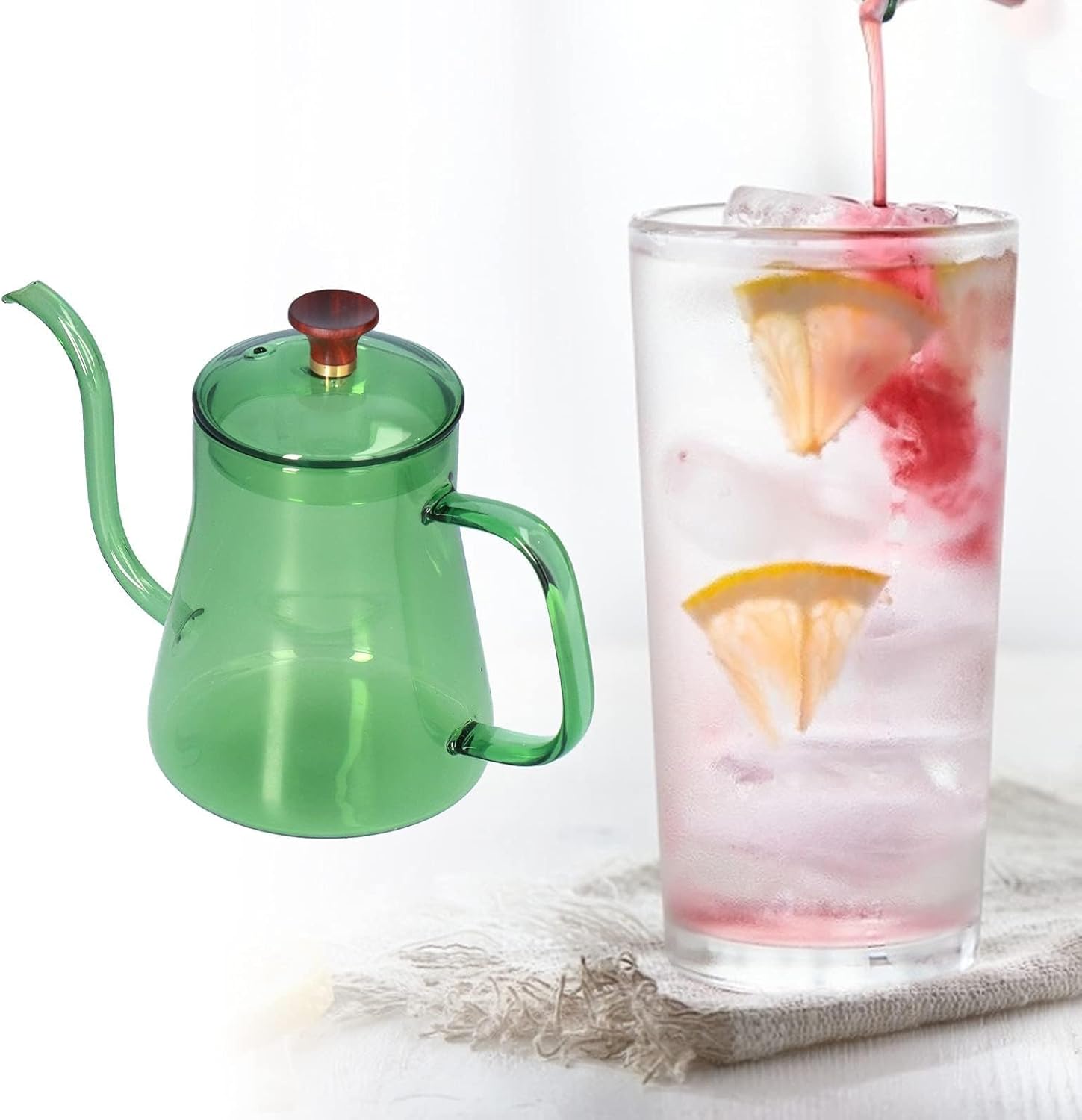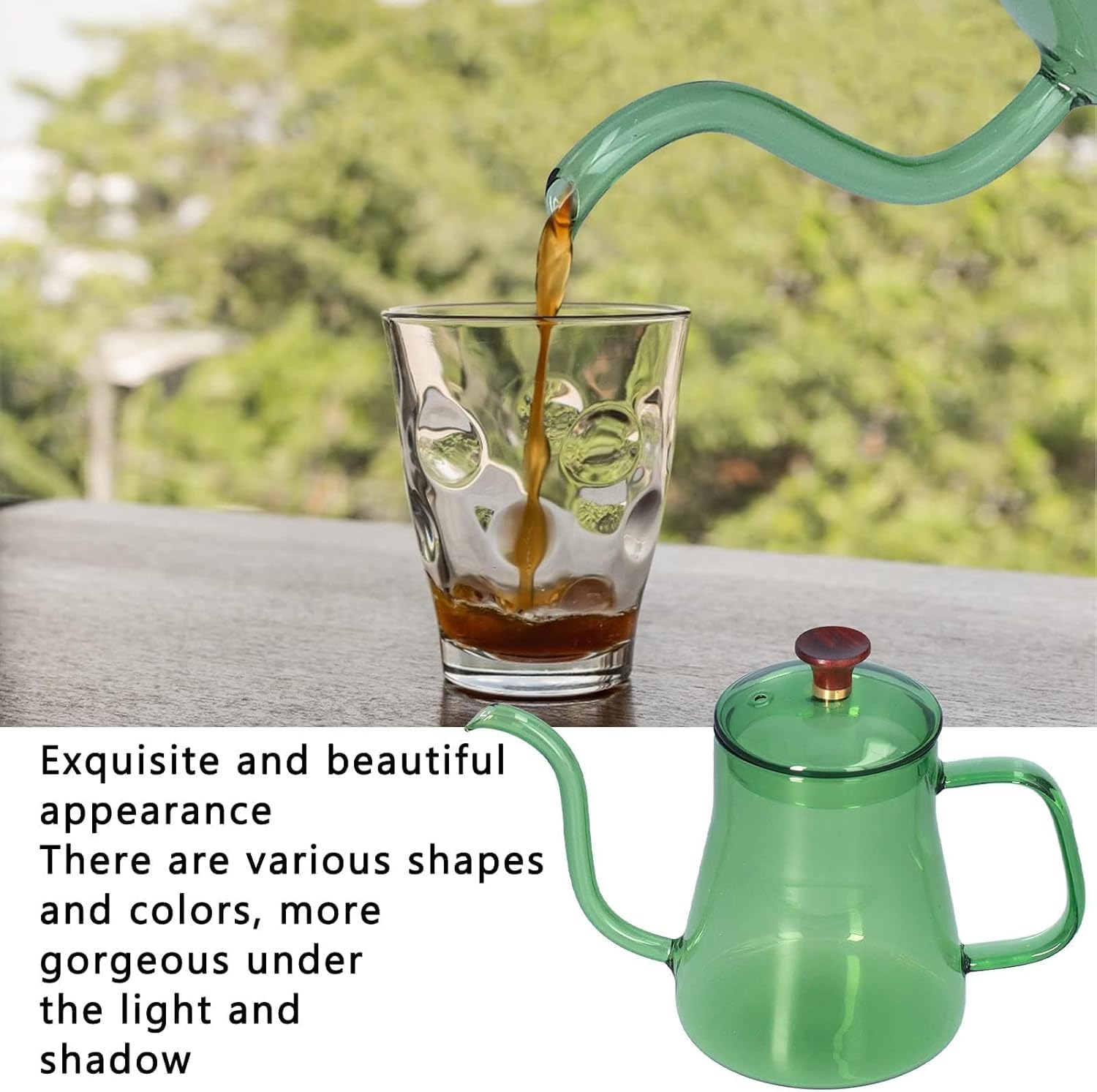 EXQUISITE AND BEAUTIFUL: Pour over coffee kettle appearance is exquisite and beautiful, with various shapes and colors, and it is more gorgeous under the light and shadowGOOSENECK KETTLE : Gooseneck tea kettle body can withstand an instantaneous temperature difference of -20° to 150°. Coffee pot can be used to hold hot or cold water, but it cannot boil water on the stoveLARGE CAPACITY: Long gooseneck spout coffee kettle adopting a gooseneck type water outlet design, the water is accurate and stable. Suitable for black tea, fruit tea, lemonade, coffee, etcWITH HANDLE: This glass coffee hand pot is equipped with a handle, which is not easy to burn, and it is convenient for you to pour water and coffee. You can use it with confidence