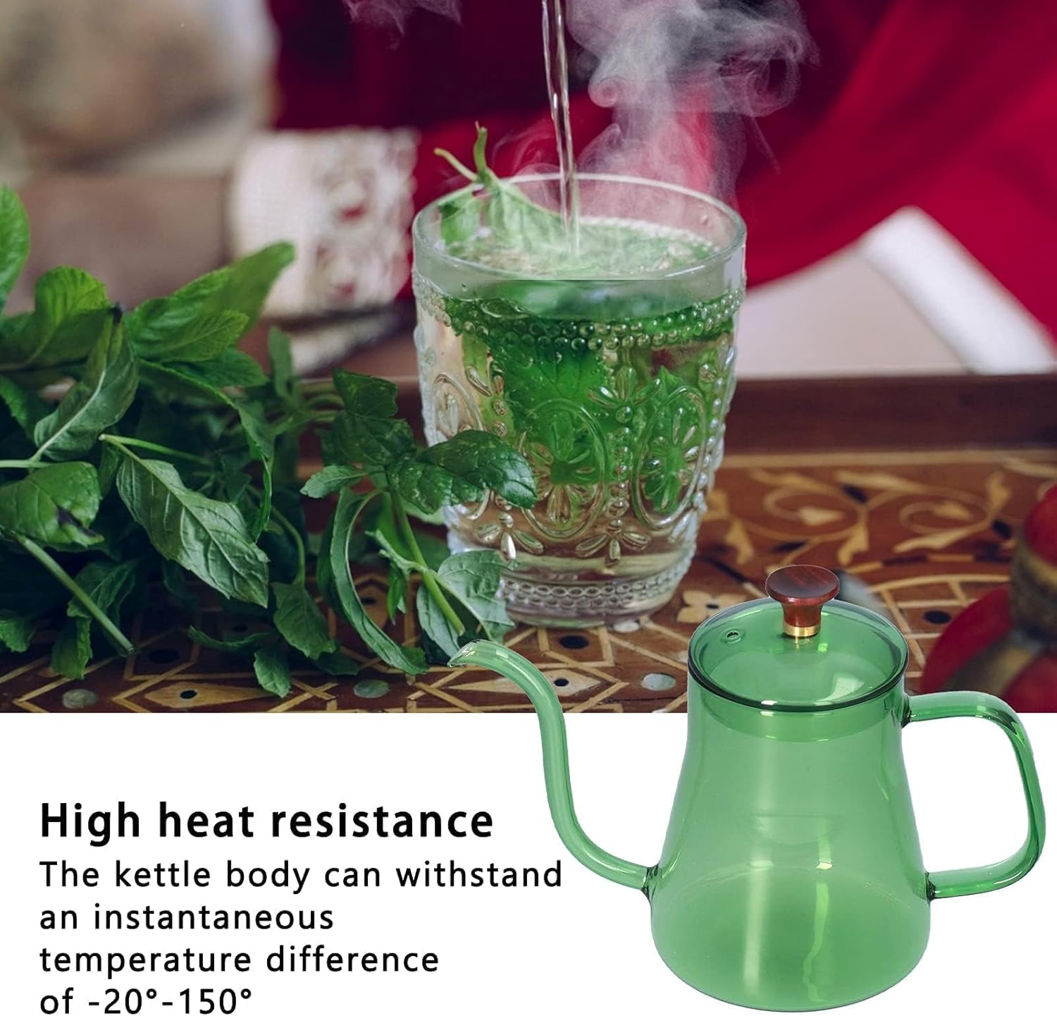 GOOSENECK KETTLE : Gooseneck tea kettle body can withstand an instantaneous temperature difference of -20° to 150°. Coffee pot can be used to hold hot or cold water, but it cannot boil water on the stove