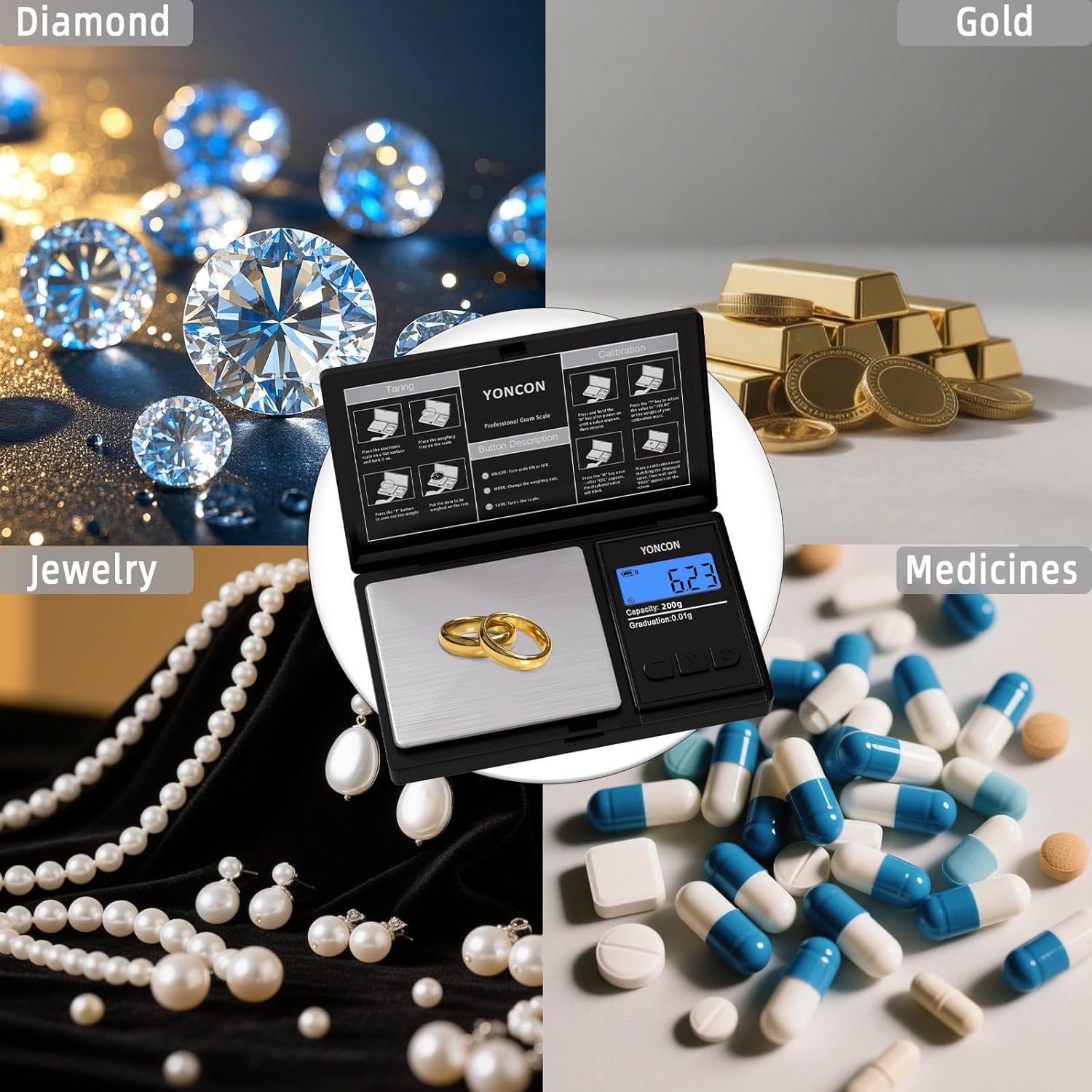 Precision Engineered for Valuables: The YONCON digital scale delivers laboratory-grade 0.01g accuracy as a professional jewelry scale, meticulously weighing gold nuggets, silver ingots, and delicate diamonds.