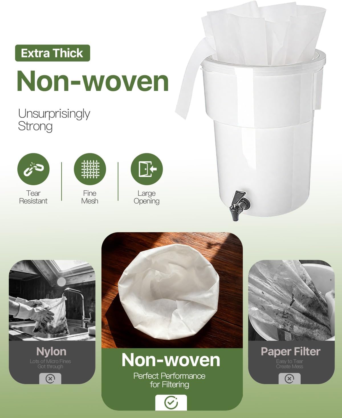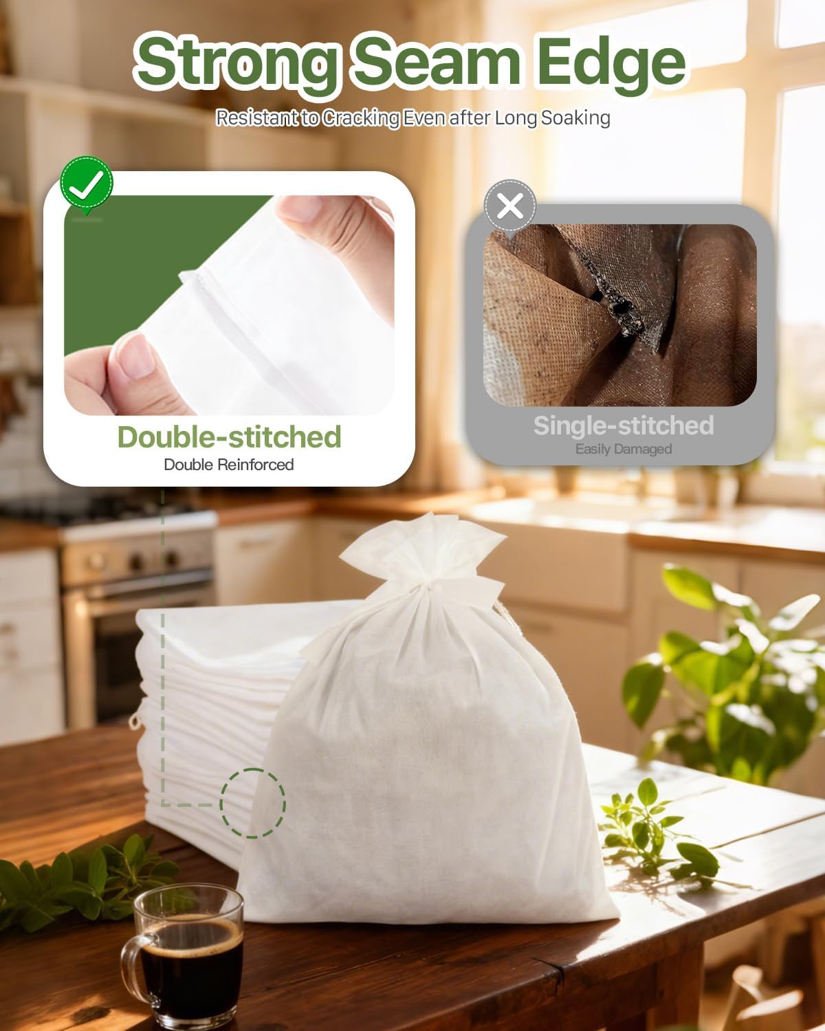 ☕ Upgraded Materials & Structure & Built to Last ☕ After comparing multiple options, we chose non-woven fabric for our filter bags. It’s more cost-effective than cotton, sturdier than paper, and strong enough to hold up to 20 pounds of coffee grounds. We also used a double-stitched design to reinforce the seams, ensuring that it won’t leak even after prolonged soaking.