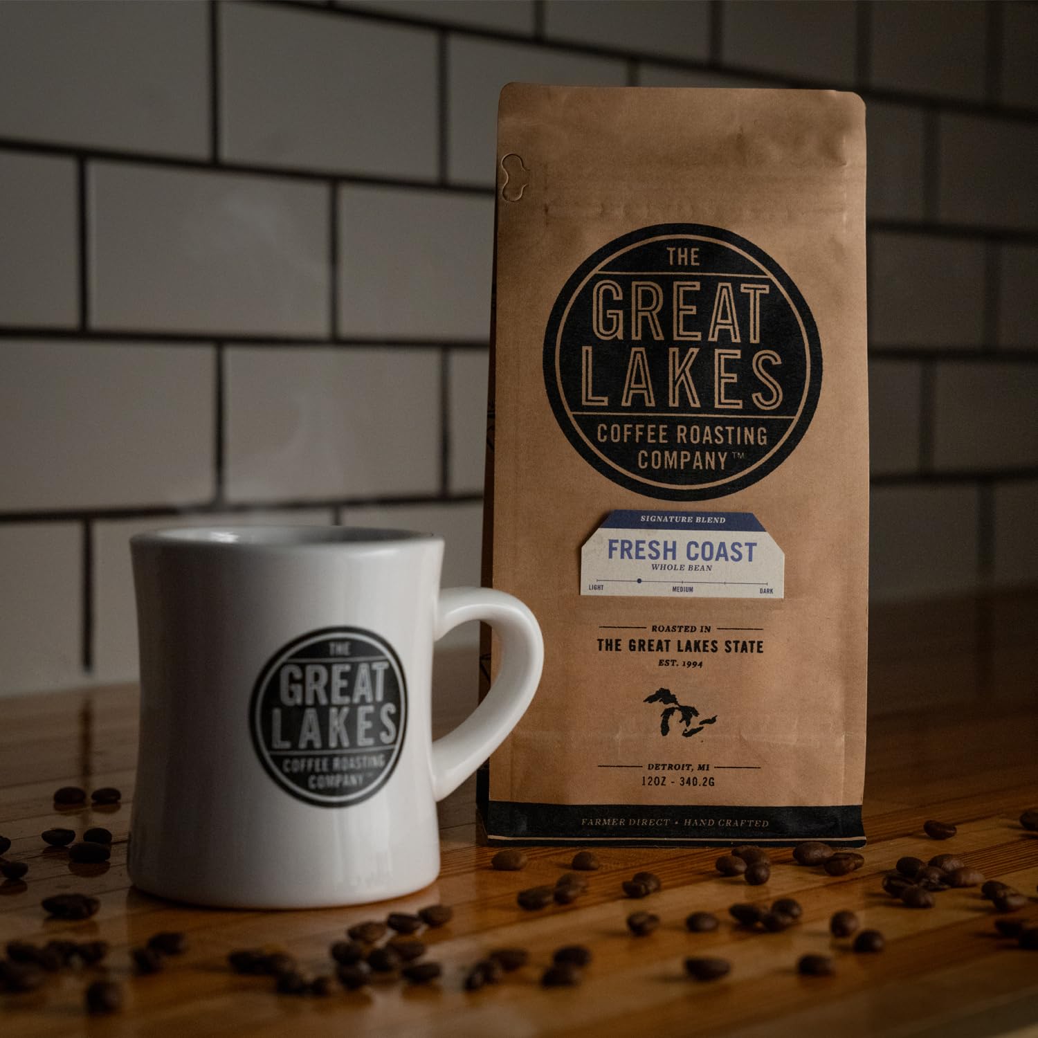 Great Lakes Light/Medium Roast Whole Bean Coffee, Fresh Coast Signature Blend, Farmer Direct Sourced from Brazil and Ethiopia, 12 Ounces