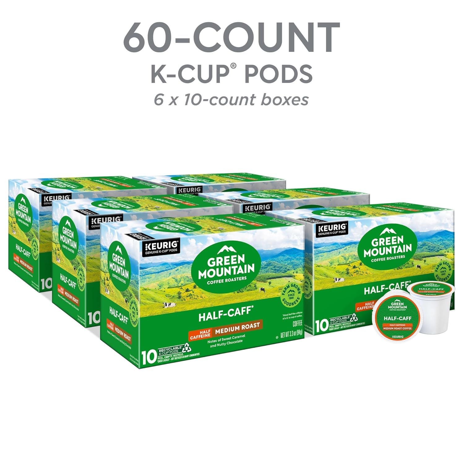 Green Mountain Coffee Roasters Half Caff, Keurig Single Serve K-Cup Pods, Medium Roast Coffee, 60 Count, (6 Packs of 10)