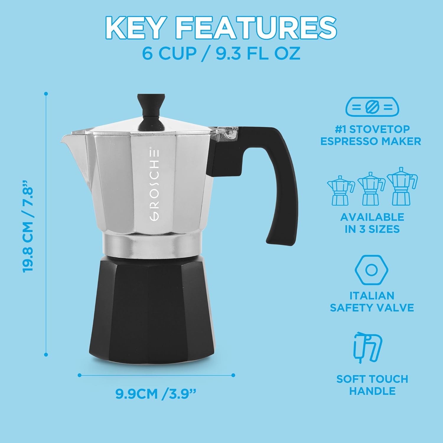 PREMIUM QUALITY: MILANO is available in a variety of espresso cup sizes, 1 cup, 3 cup, 6 cup, 9 cup, and 12 cup – MILANO is made from food grade anodized aluminum, has a large soft touch handle with a burn guard for your finger, and the safety valve is Made in Italy, keeping you safe from high pressure buildup.