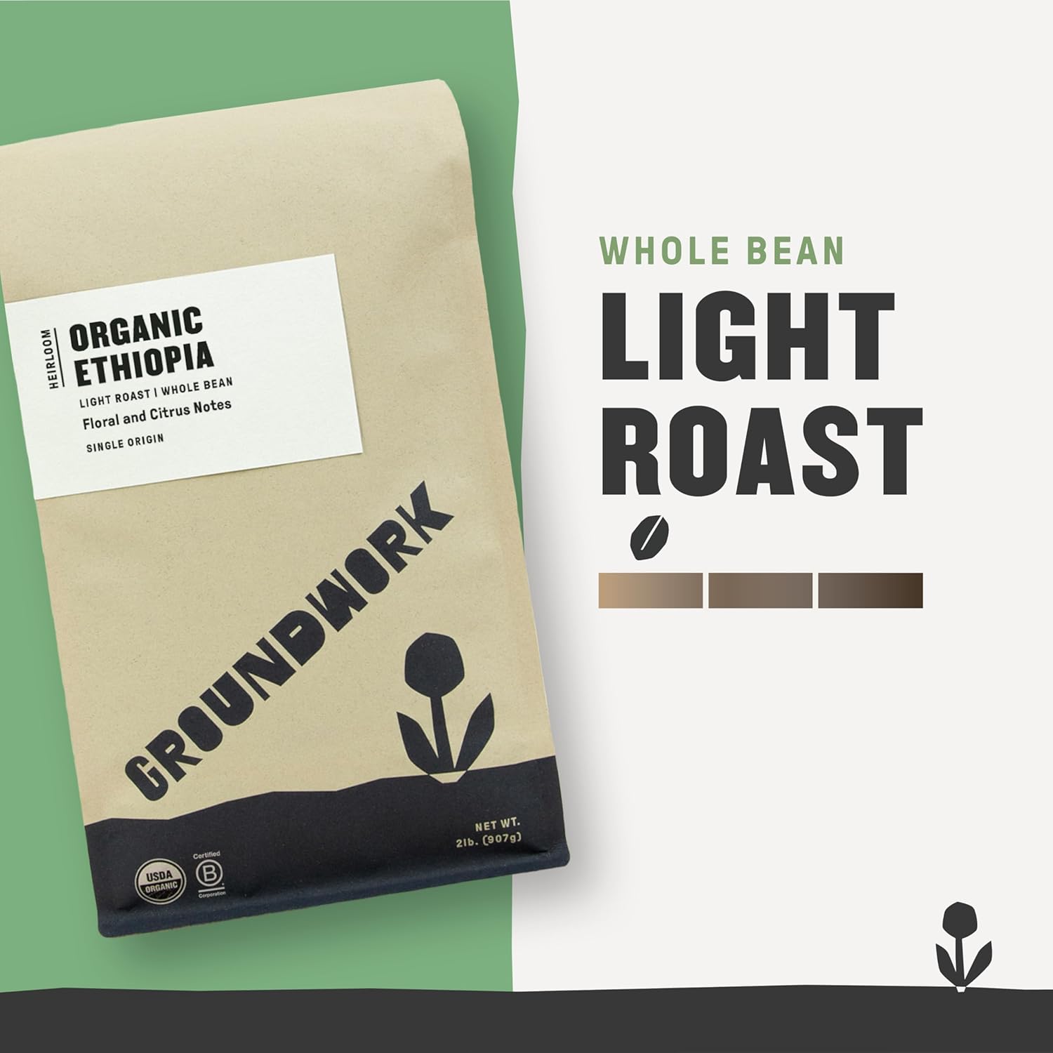 GROUNDWORK Ethiopia Heirloom Blend – Whole Bean Coffee Light Roast – Certified Organic Single Origin Coffee – 2lb Bag
