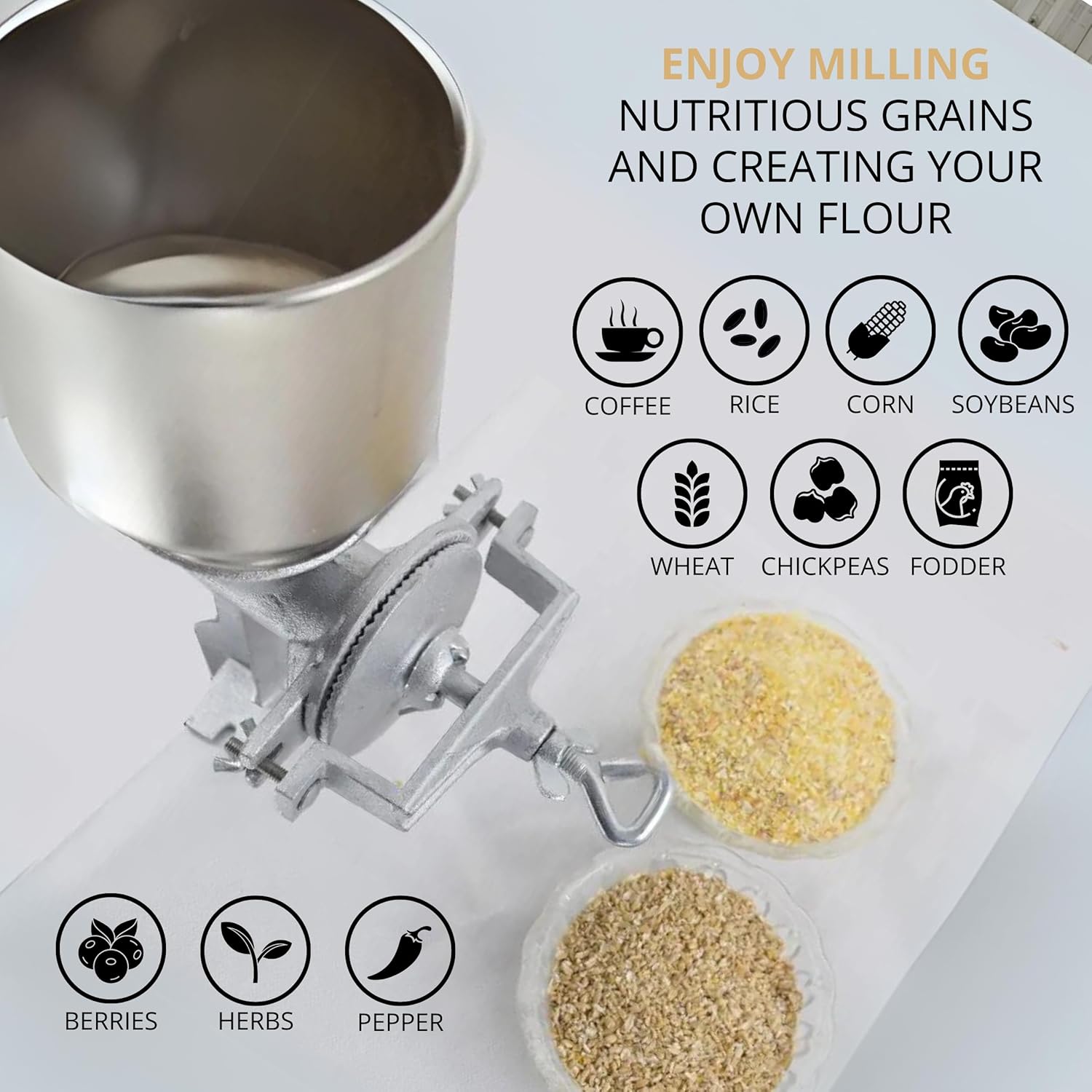 Iron Mill: Grain mill grinder for home is the perfect tool for grinding corn, wheat, and other grains at home. With our manual flour mill, you can enjoy the freshness and nutritional benefits of homemade flour. Its sturdy construction ensures reliable performance for all your grain grinding needs