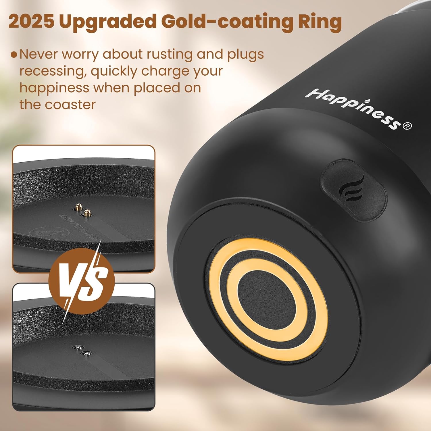 Easy to Clean:This heated tea mug come with IPX7 waterproof materials and it is safe and easy to clean .compared with other brand , we use the upgraded expensive gold -coating ring help to protect rusting,ensure the long life for this heated mug.Notes: 1.Please hand wash only, Do not use dishwasher.2.*Clean with tap water. Do not use boiling water.