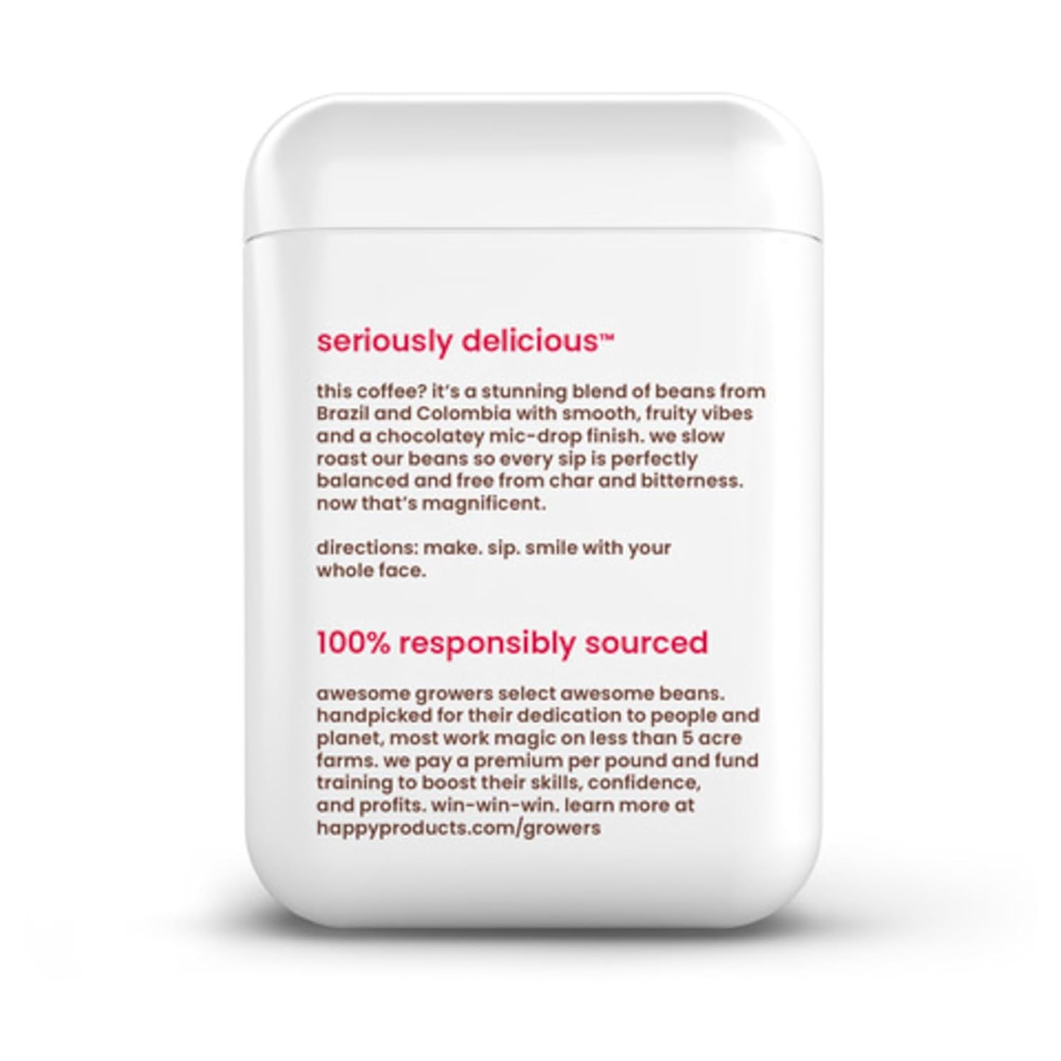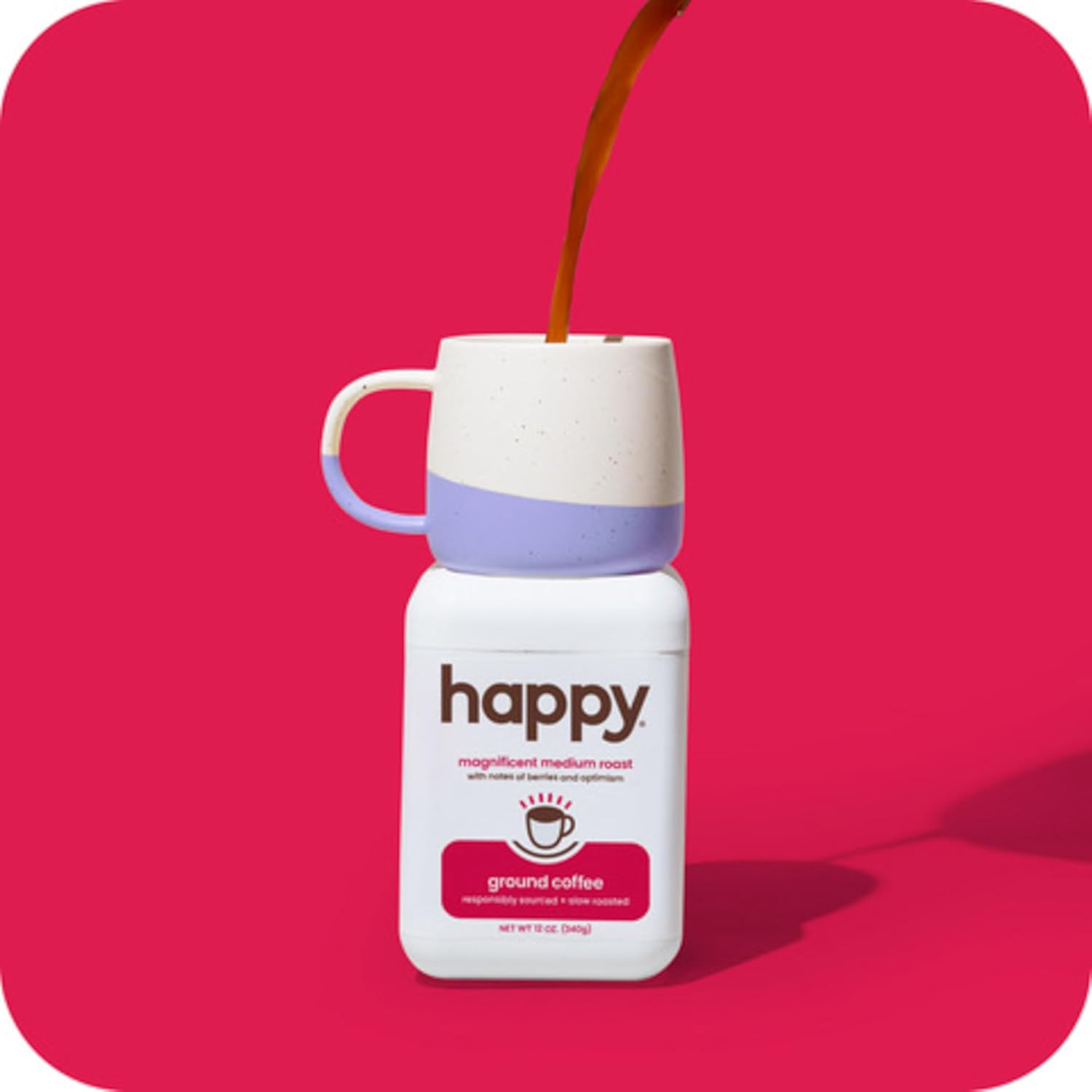 seriously delicious: start your morning off right with happy’s magnificent medium roast ground coffee, thoughtfully sourced and expertly blended with notes of berries and optimism.