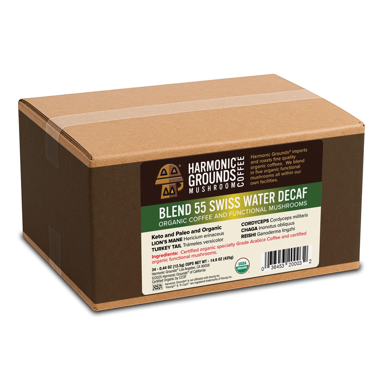 Harmonic Grounds Organic Decaf Mushroom Coffee Pods – Swiss Water Process, Medium Roast with Lion’s Mane, Reishi, Chaga, Cordyceps & Turkey Tail – Compatible with Keurig K-Cup Brewers – 34 Count
