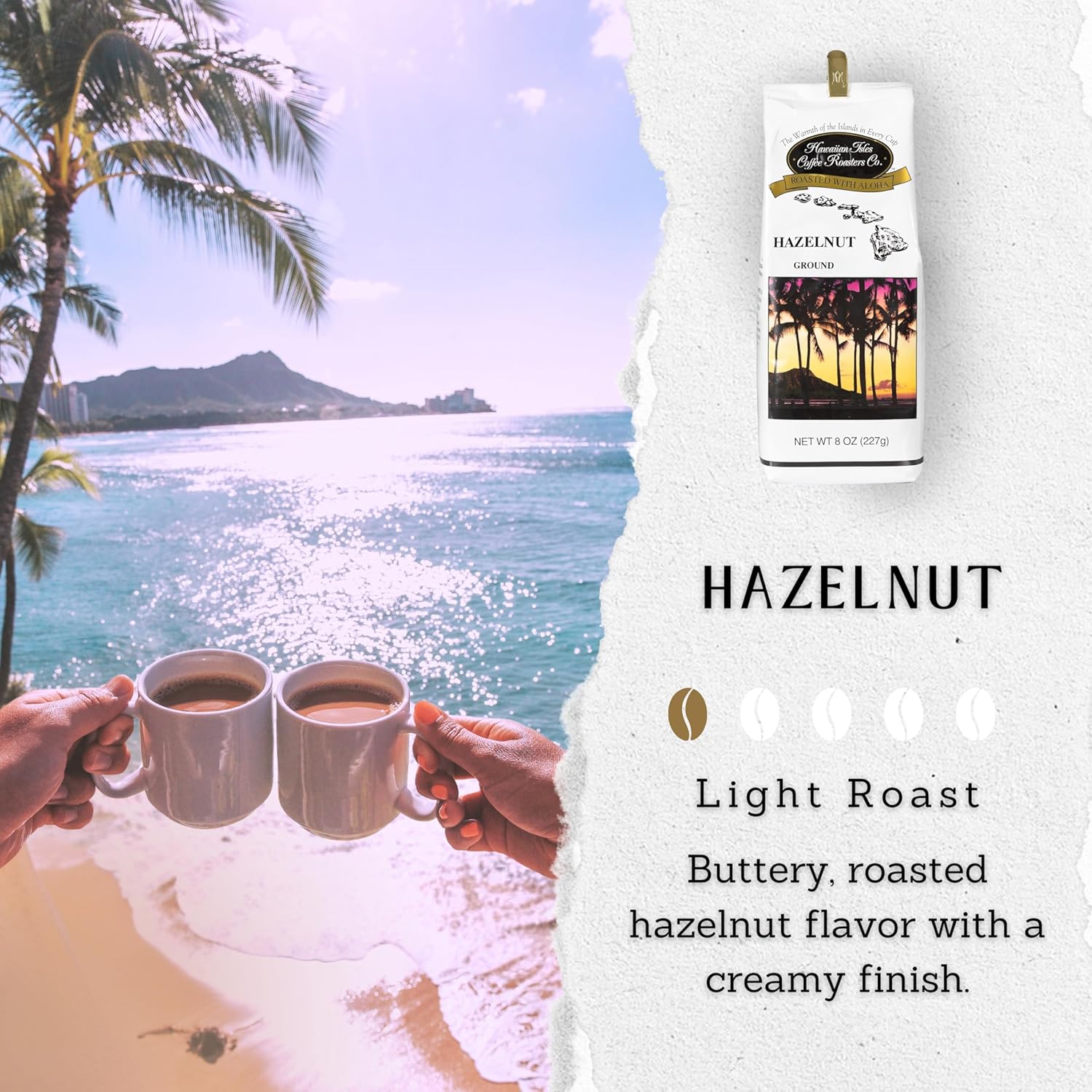 ALOHA FROM HAWAII: Sweet & Nutty, indulge in a symphony of flavors, where premium Arabica beans meet the irresistible allure of hazelnuts, creating a delightful and aromatic coffee experience