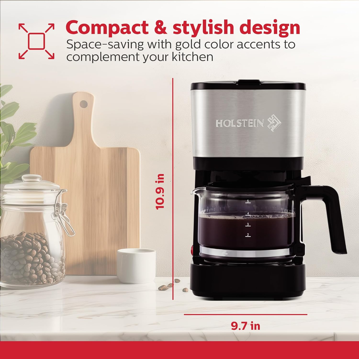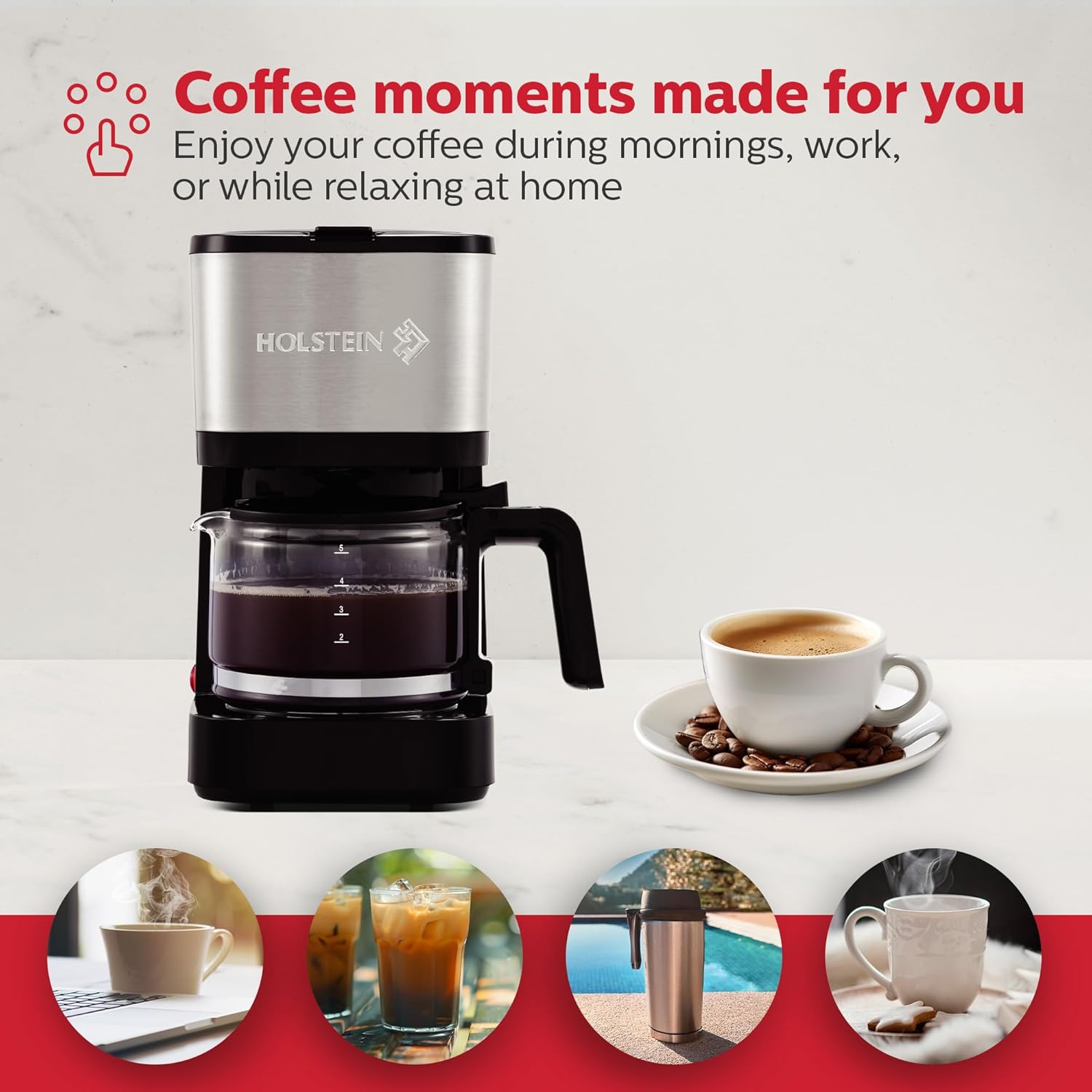 Holstein Housewares 5 Cup Coffee Maker – Compact Drip Coffee Machine with Auto Pause & Serve, Reusable Filter, Glass Carafe, Water Window & Warming Plate, Black