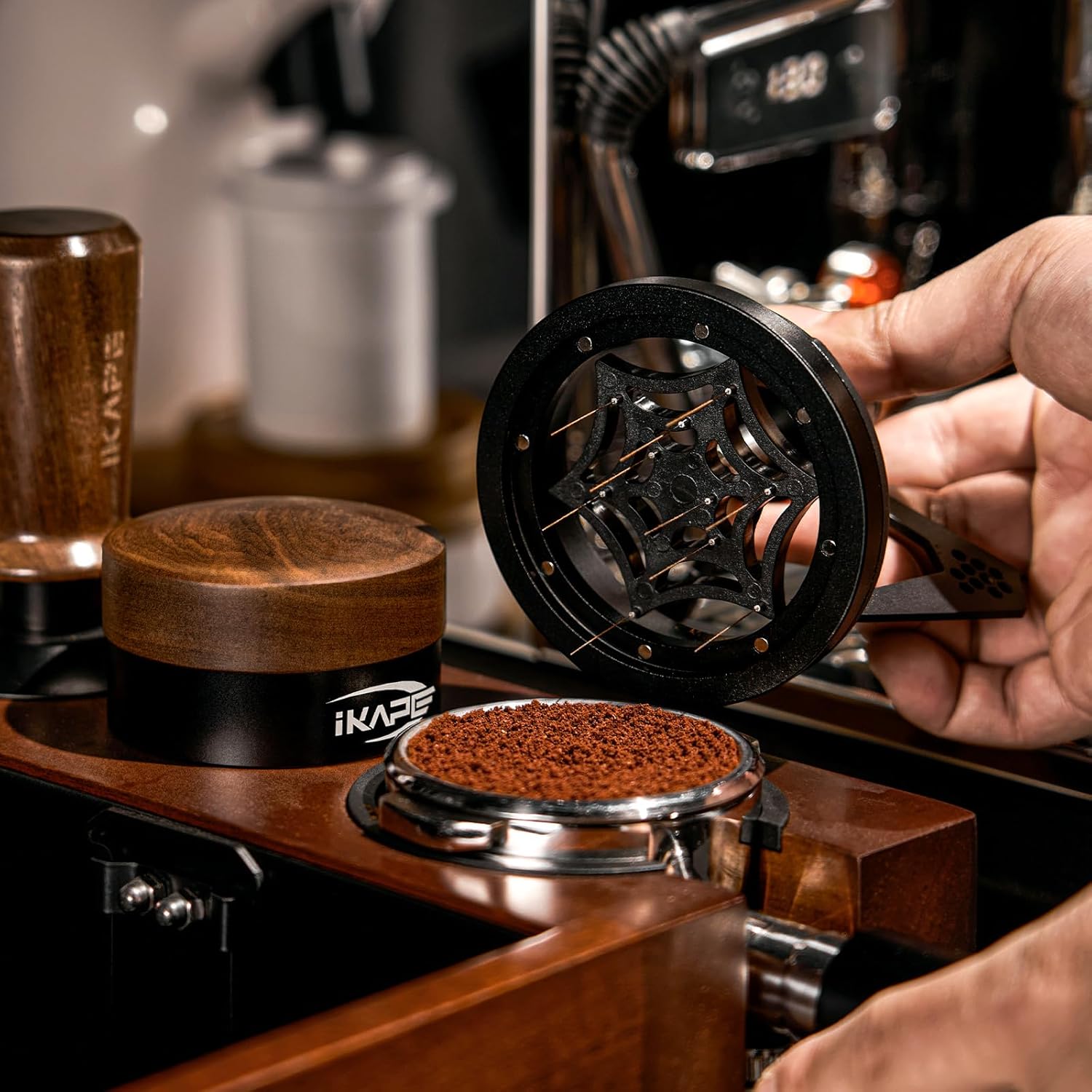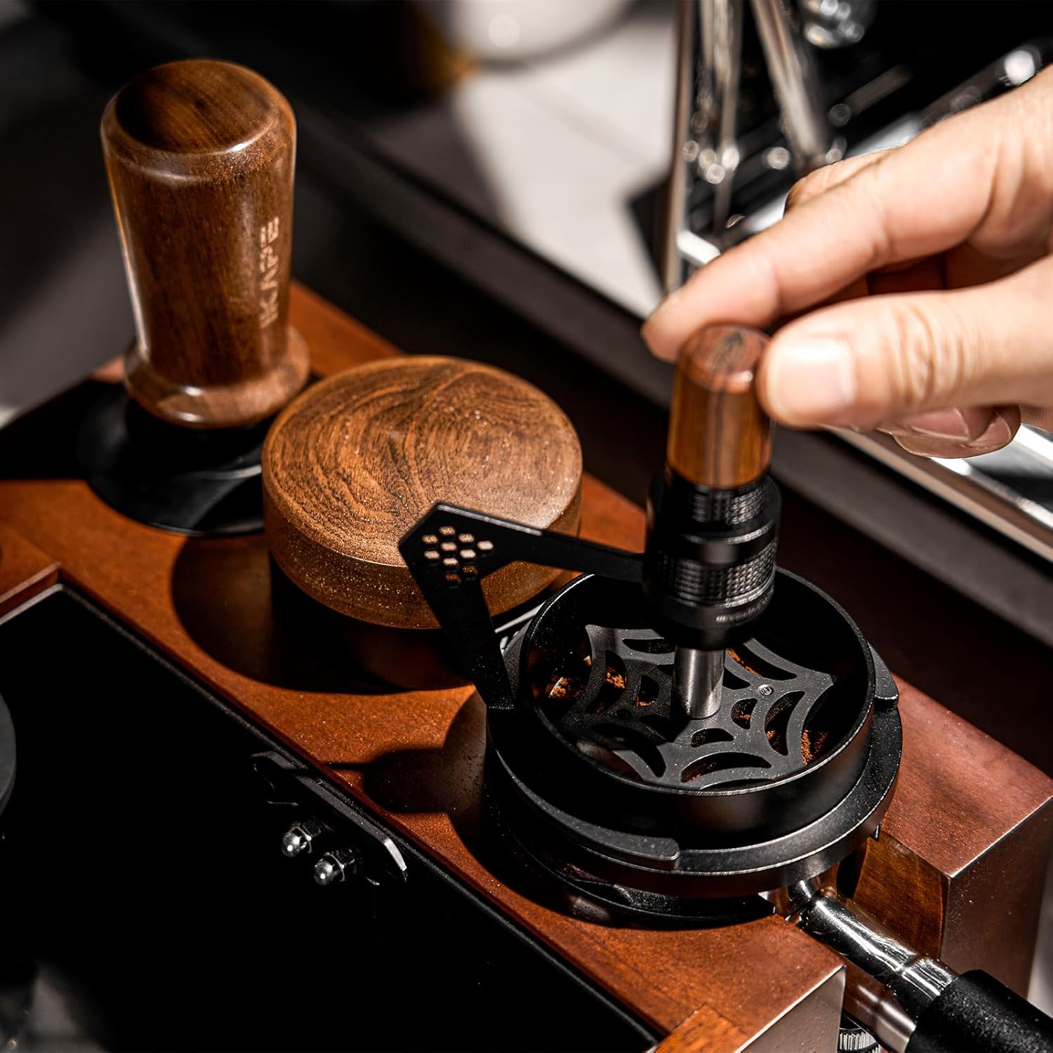 IKAPE Mantis WDT Distribution Tool with Clean Brush, 58.5mm Espresso Stirrer Distribution Tool for Barista, 8 Needle Espresso Stirrer with Dosing Funnel &Stand, Adjustable Needle Height, Walnut Handle