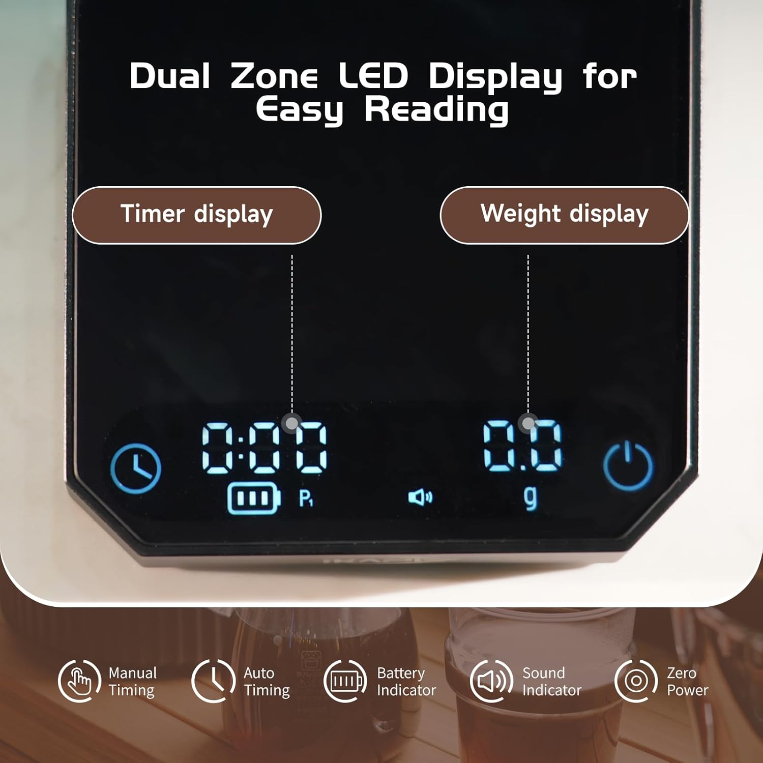 Precise Measurement & Extensive Range – Our digital coffee scale boasts a high accuracy of 0.1g, spanning a wide range from 0.3g to 2001g. Ideal for crafting coffee, it ensures a delightful espresso every morning, setting a positive tone for your day