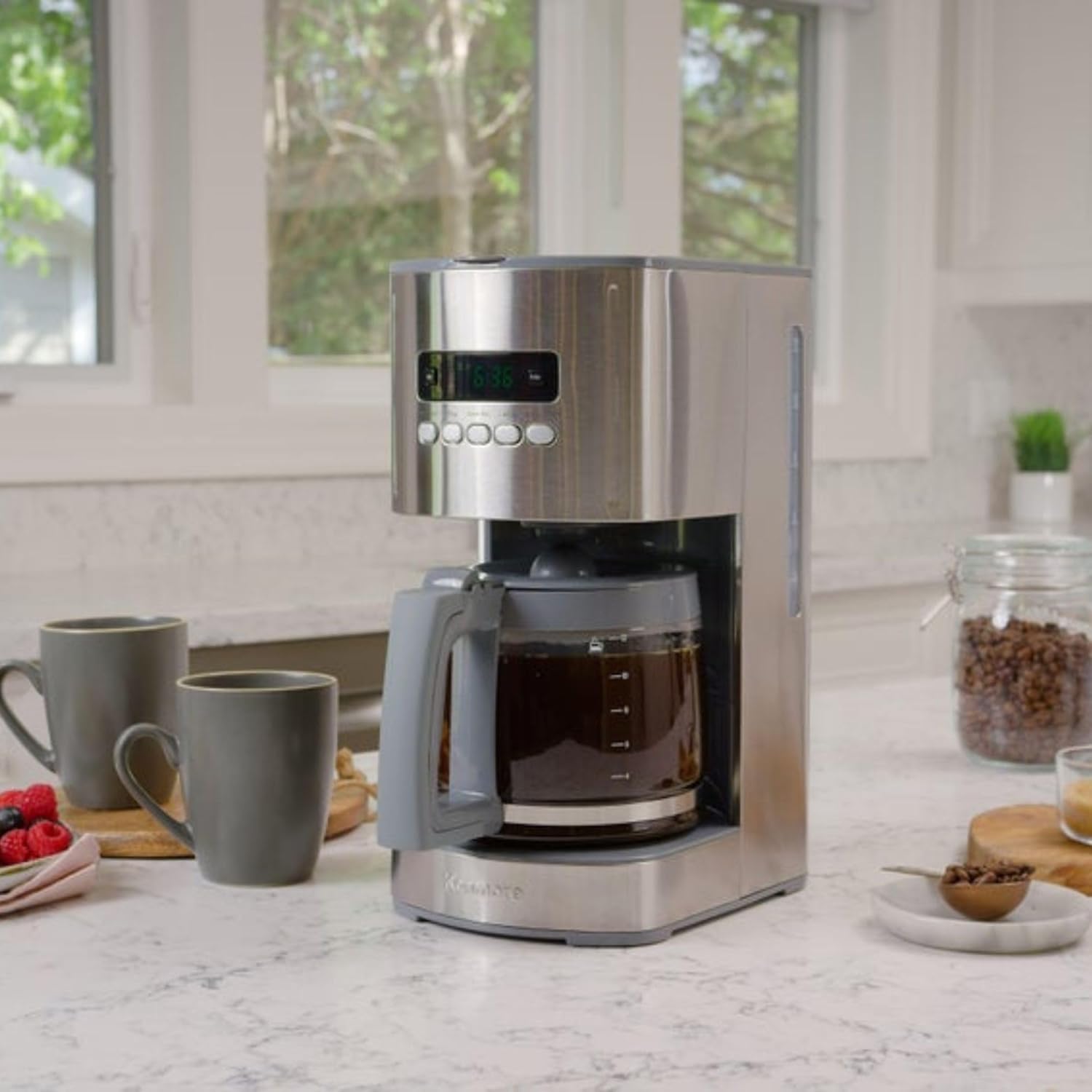 Start your day with the aroma of freshly brewed coffee using the Kenmore 12-Cup Programmable Drip Coffee Maker. Designed for convenience and versatility, this coffee maker combines modern features with classic brewing performance. The large 12-cup glass carafe and spacious water reservoir make it ideal for households, offices, or coffee stations, reducing the need for frequent refills. Customize your brew with Regular or Bold strength settings, perfect for those who enjoy a smooth morning cup or a stronger café-style flavor. The programmable timer allows you to schedule brewing in advance, so your coffee is ready when you need it. This cafetera programable is a practical choice for busy mornings and gatherings. Safety and sustainability are built in with auto shut-off and a reusable coffee filter, eliminating the need for paper filters and supporting eco-friendly practices. The compact design fits easily on any countertop, while the sleek finish complements modern kitchens and office spaces. Backed by a two-year limited warranty, the Kenmore drip coffee maker offers reliable performance and support. Whether you call it a coffee pot, cafetera eléctrica, or percoladora de café, this appliance combines functionality and style for everyday coffee enjoyment.
