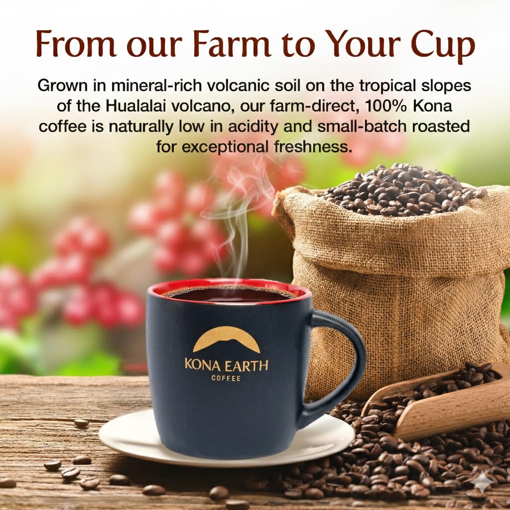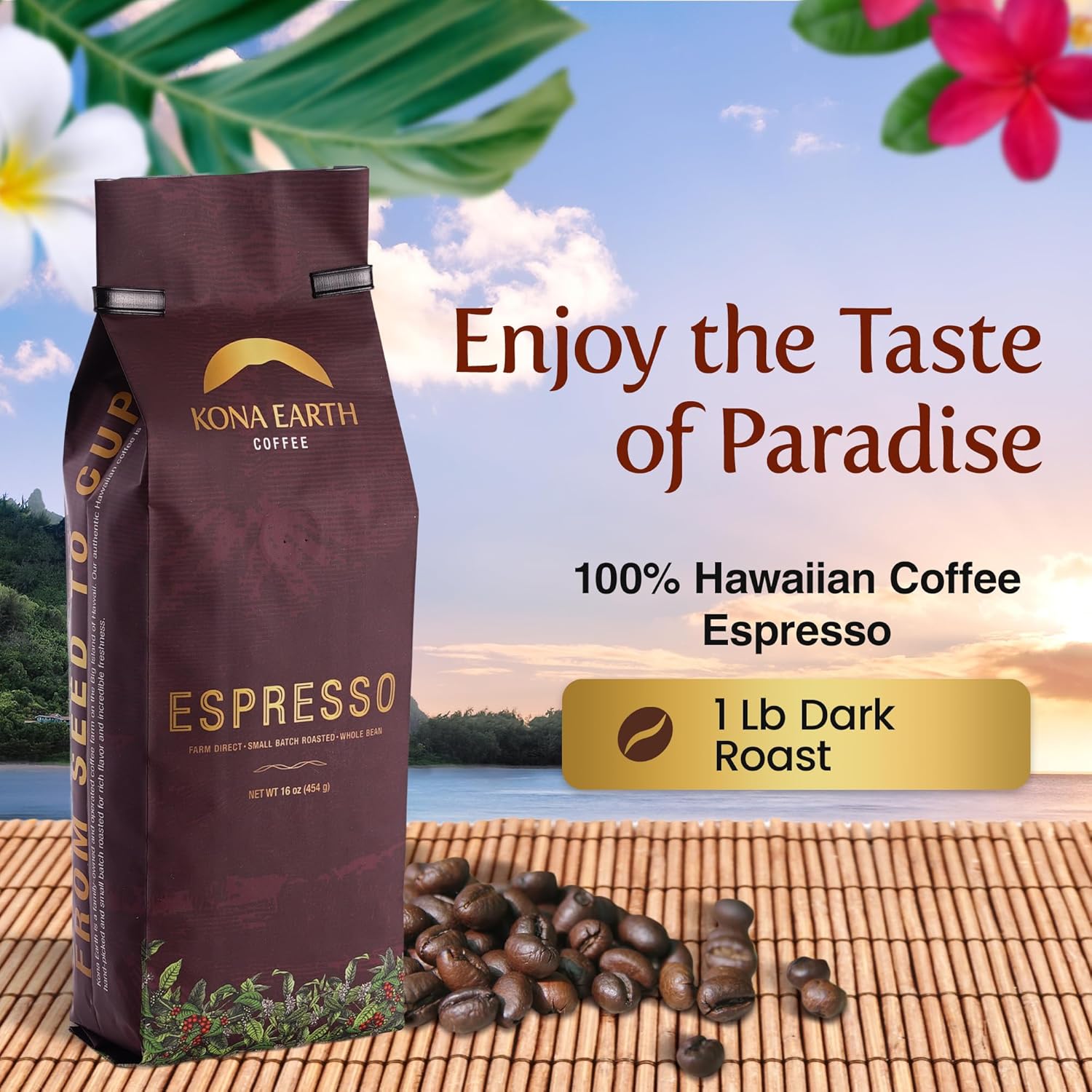 Kona Earth – Dark Roast Hawaiian Espresso, Whole Bean, 1lb (16 oz) Farm-Direct coffee beans from Hawaii’s Big Island, Micro-Batch-Roasted