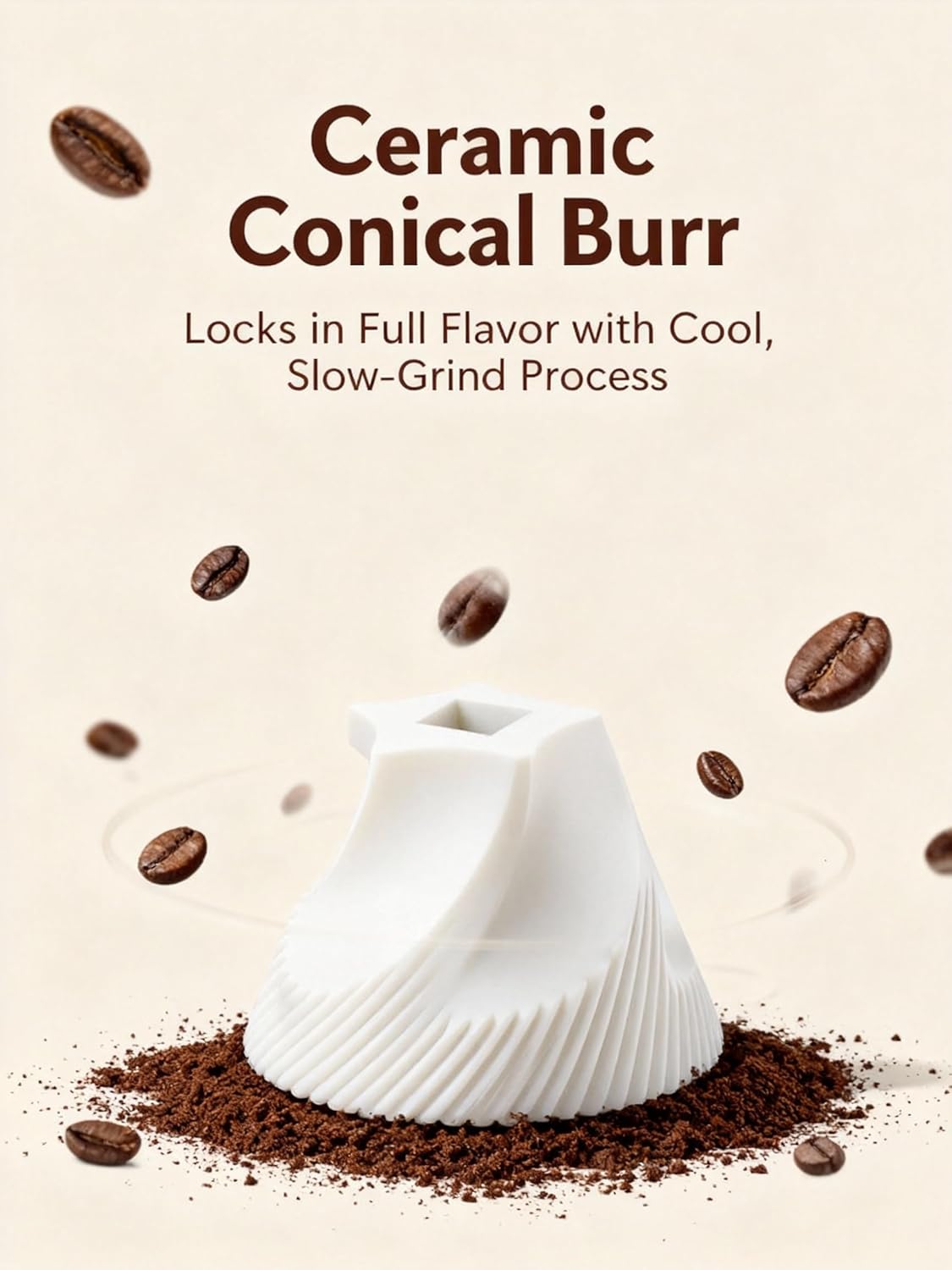 Advanced Ceramic Burr – Durable, Cool & Flavor-Preserving:Equipped with a high-strength ceramic grinding core that stays cooler than stainless steel burrs, prevents overheating, and extends durability. Delivers consistent grounds while protecting delicate coffee aromas