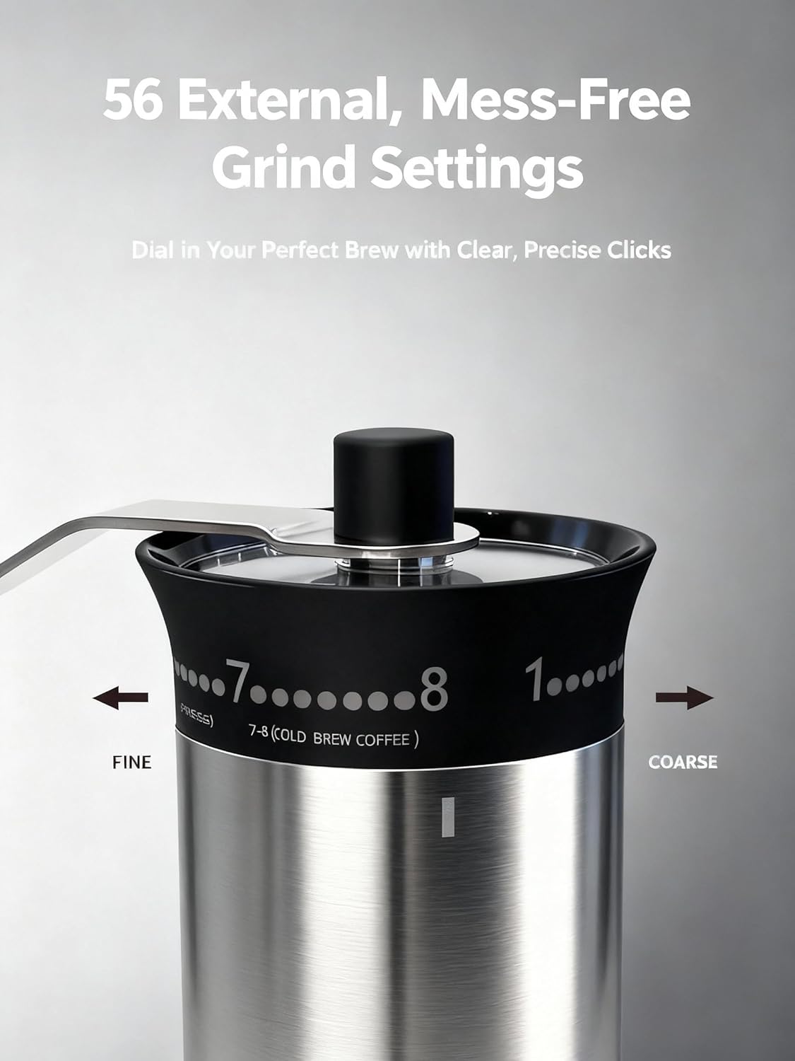 56 External Grind Settings – No Disassembly Required:Experience effortless precision grinding with 56 external adjustment clicks. Unlike traditional grinders, our innovative design allows you to change grind size instantly—from fine espresso to coarse French press—without taking the grinder apart