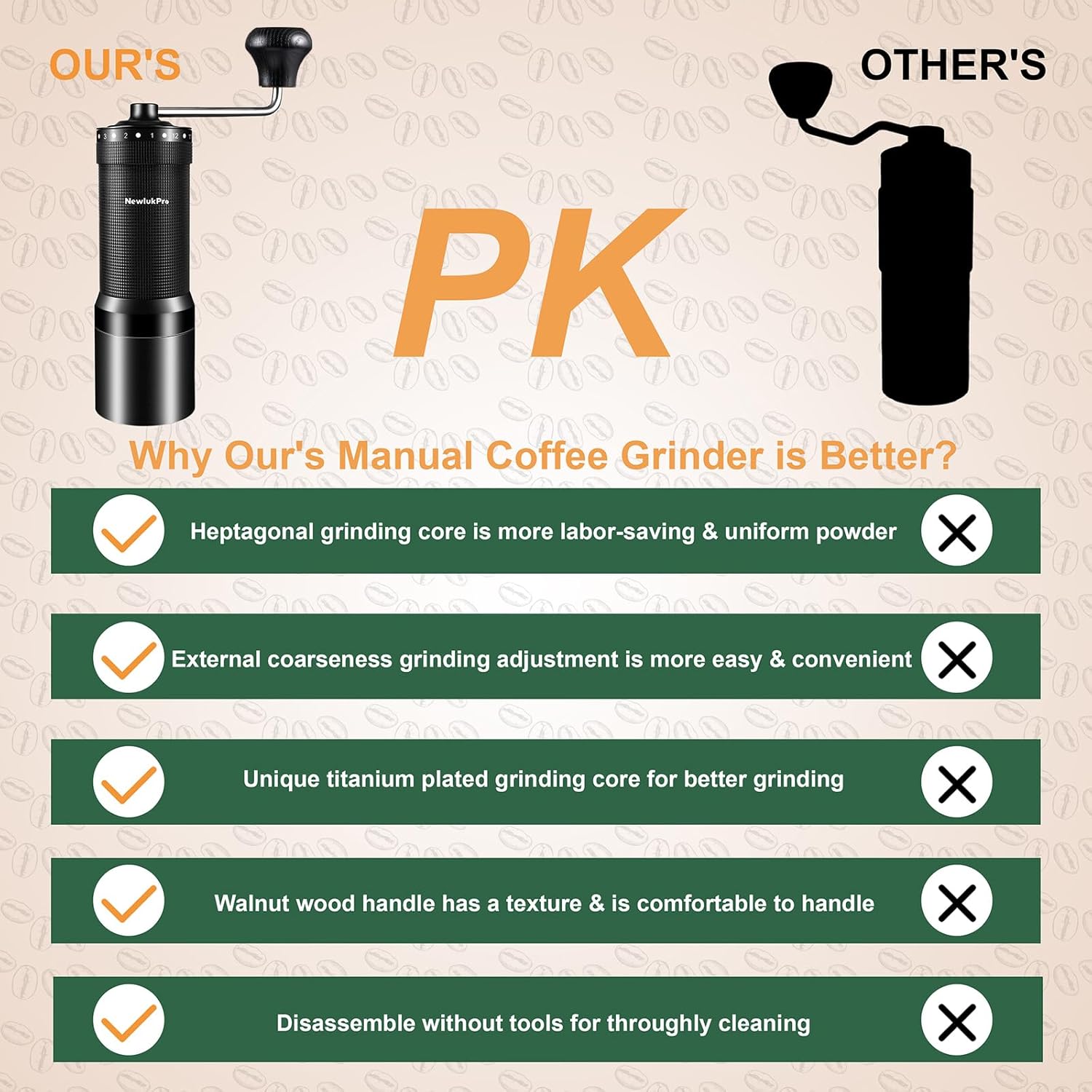 UPGRATED MANUAL GRINDER — NewlukPro M7 Pro coffee grinder manual has anti slip aluminum alloy body,unique Titanium coating Heptagonal mill burr & comfortable wooden handle.It saves physical strength & outputs evenly coffee powder.Our manual coffee bean grinder has consistent uniform grinding & high grinding efficiency ! Helps you make a freshly ground delicious coffee when you want !