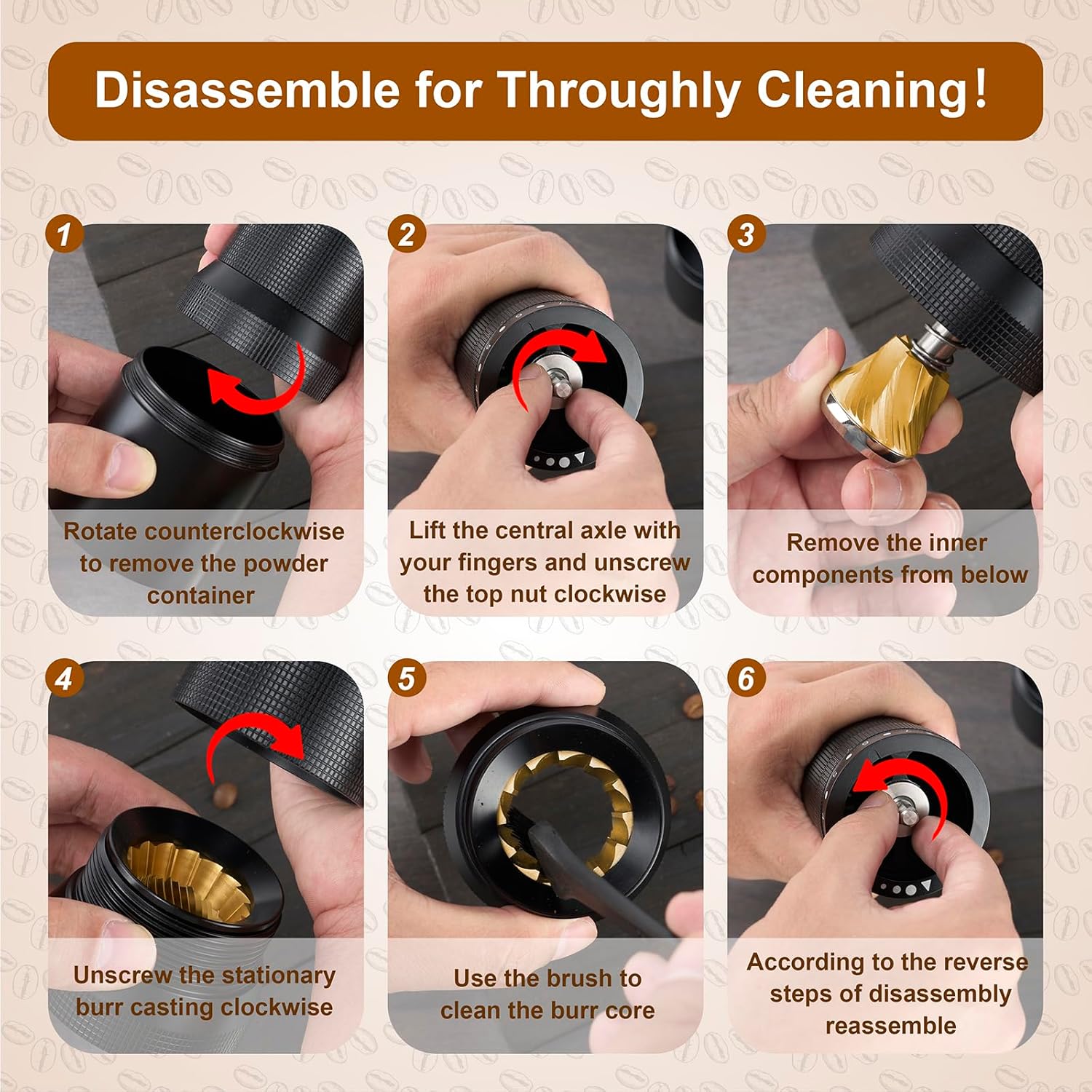 EASY TO USE & CLEAN —- You can set the grinding coarseness easily for your customizable coffee flavors with external coarseness adjustment ring.The ergonomic crank handle helps you enjoy the convenience of easy grinding without wrist strain.Our hand coffee bean grinder is easy to disassemble without any tools.You can use the complimentary clean brush to complete the cleaning.