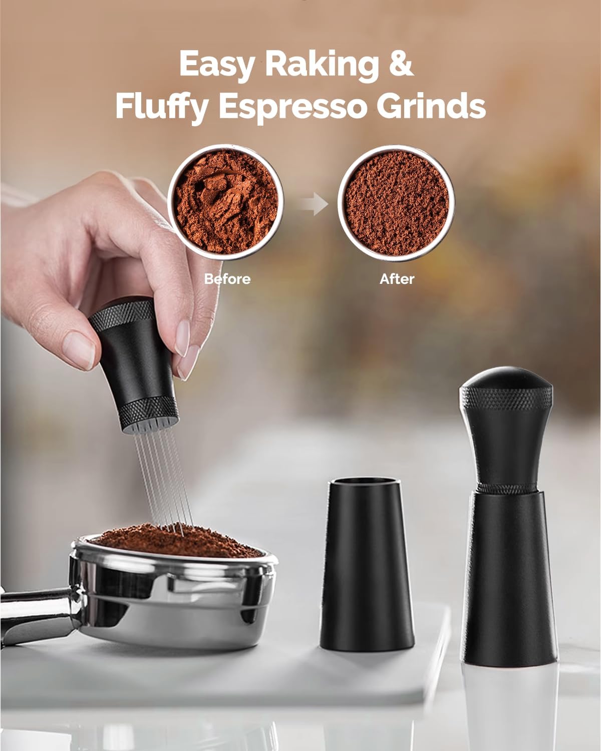 Espresso Stirrer Tool: Needles evenly distributed design,the perfect size for breaking up coffee clumps.This tool guarantees even distribution, maximizes extraction, and minimizes channeling for the perfect espresso shot