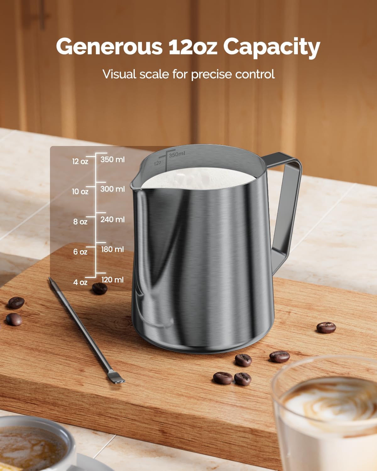 Clear Measurement Scale: Setting our milk pitcher apart from others, it boasts clear internal measurement lines for accurate portion control of milk or cream per cup of coffee. Additionally, it can be used to measure various liquids such as milk, cream, water, juices, batter mixes, and smoothies